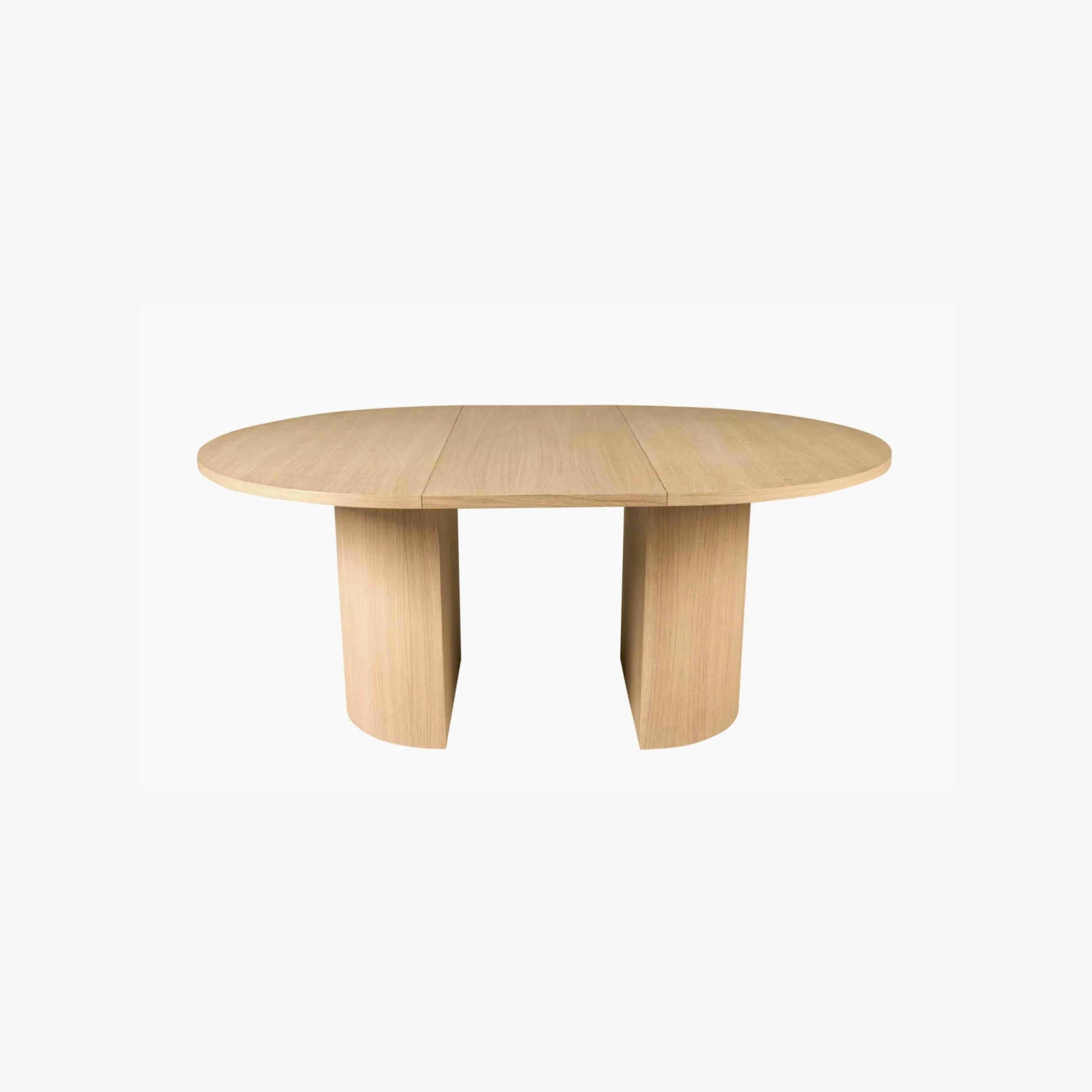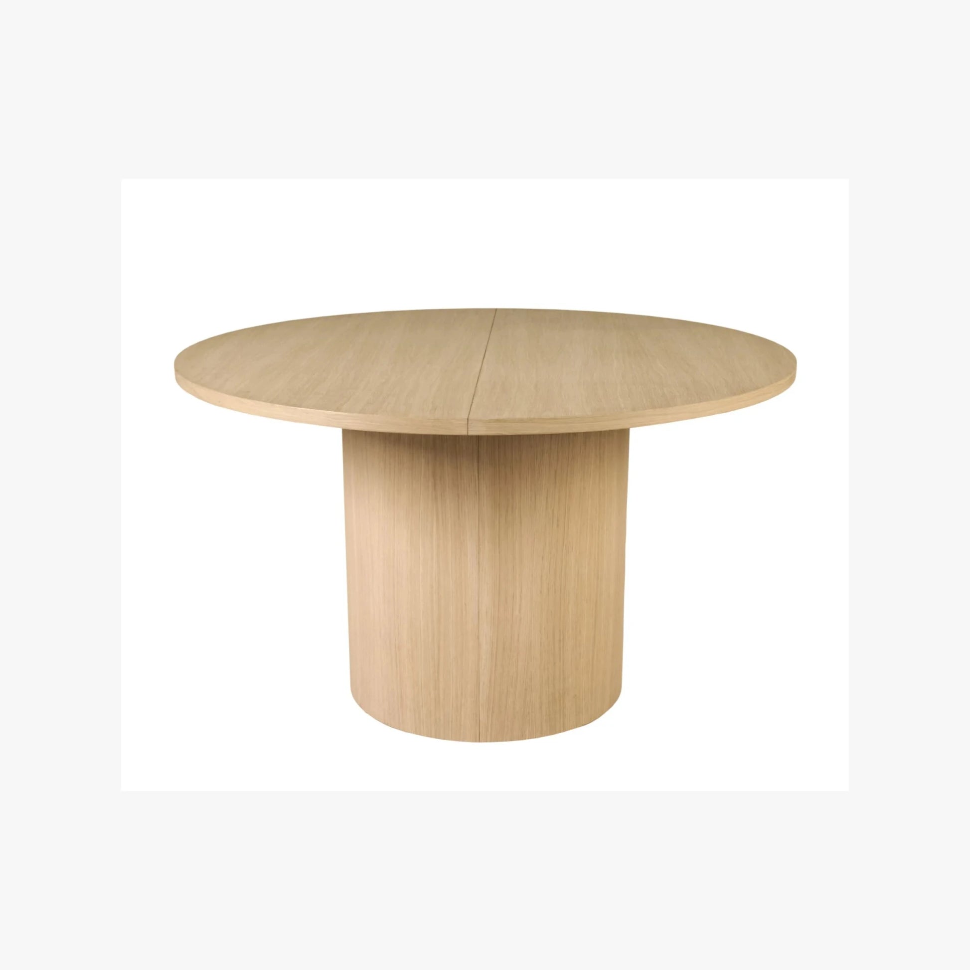Praktisk, solid og stilsikkert spisebord med rund form og mulighet for opptil to ileggsplater (en ileggsplate er inkludert). Bordet har en minimalistisk, matt og slett finish i eikefiner som gir et eksklusivt preg. Den runde formen tilfører et tidsriktig uttrykk og inviterer til sosiale middager. Den unike sokkelen i midten istedenfor tradisjonelle bordben gjør det enklere å plassere stoler rundt bordet, samtidig som uttrekksmekanismen ikke bygger nedover under bordplaten, noe som gir god plass til bena.