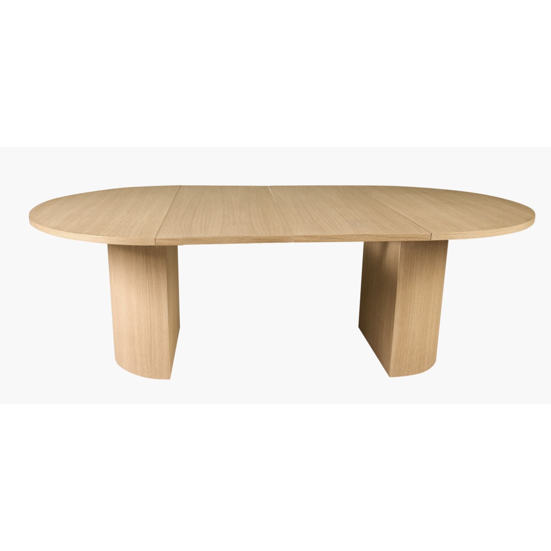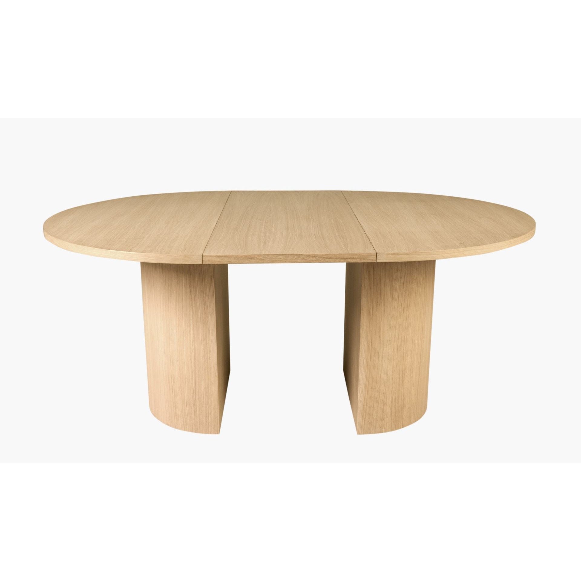 Praktisk, solid og stilsikkert spisebord med rund form og mulighet for to ileggsplater (en ileggsplate er inkludert). Bordet har en minimalistisk, matt og slett finish i eikefiner, som gir et eksklusivt preg. Den runde formen tilfører et tidsriktig uttrykk i rommet og inviterer til sosiale, hyggelige middager! Bordets smarte design med sokkel i midten gir enklere plassering av stoler rundt bordet, samtidig som uttrekksmekanismen ikke bygger nedover under bordplaten, noe som gir god plass til bena.