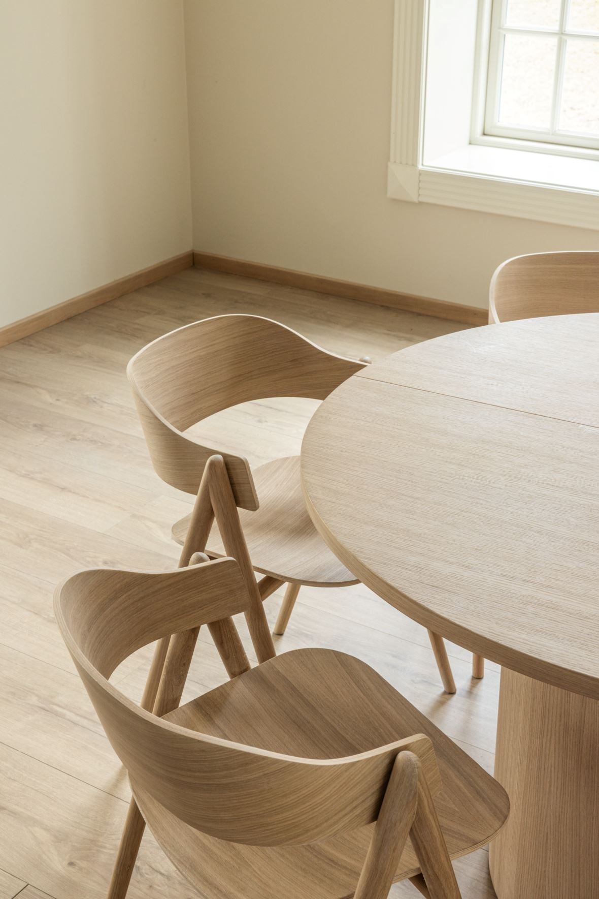 Praktisk, solid og stilsikkert spisebord med rund form og mulighet for to ileggsplater (en ileggsplate er inkludert). Bordet har en minimalistisk, matt og slett finish i eikefiner som gir et eksklusivt preg, og den runde formen tilfører et tidsriktig uttrykk i rommet. Et rundt bord inviterer også til sosiale, hyggelige middager! Legg også merke til den praktiske utformingen med sokkel i midten i stedet for bordben. Dette gjør det enklere å plassere stoler rundt bordet, samtidig som uttrekksmekanismen ikke bygger nedover under bordplaten og det blir god plass til bena. Bordet fåes i både sort og hvitoljet eik. Den naturlige overflaten i eik gir hvert bord naturlige variasjoner fra bord til bord. En unik finish laget av de naturlige mønstrene i treverket.