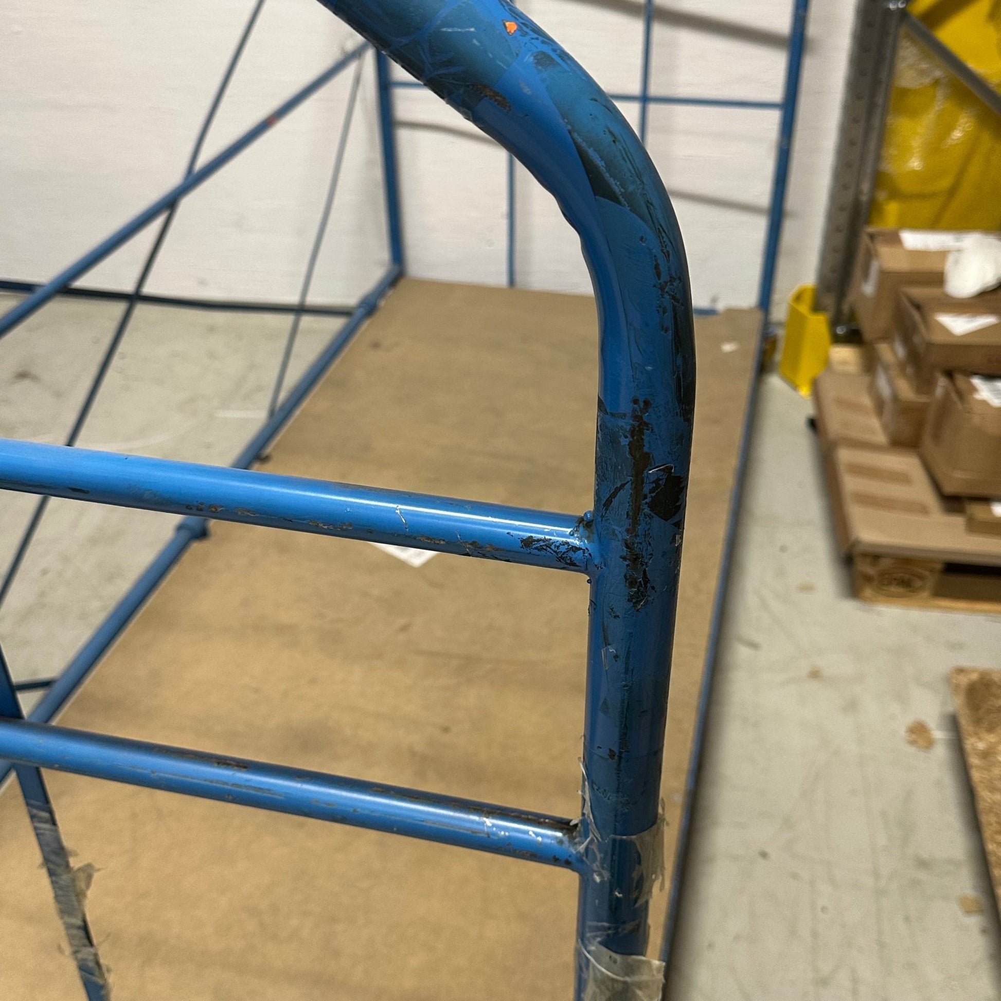 Burene er brukt med noen slitasje på hjul og ramme, men fungerer fortsatt tilfredsstillende. Noen bur har tekstilrester fra tidligere bruk, men dette påvirker ikke bruken.