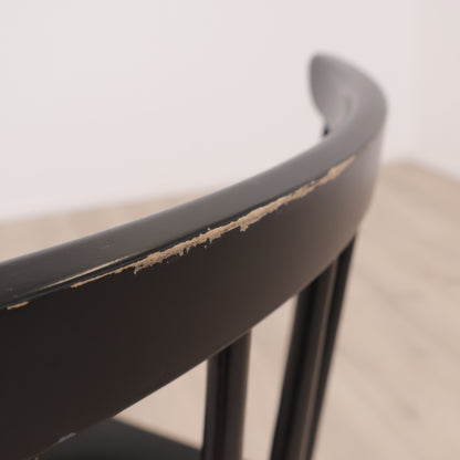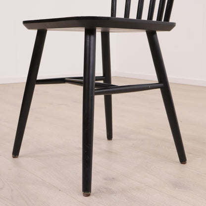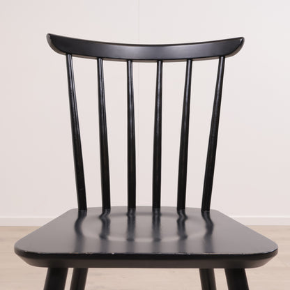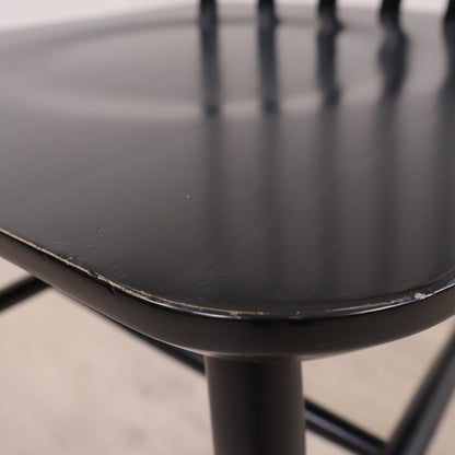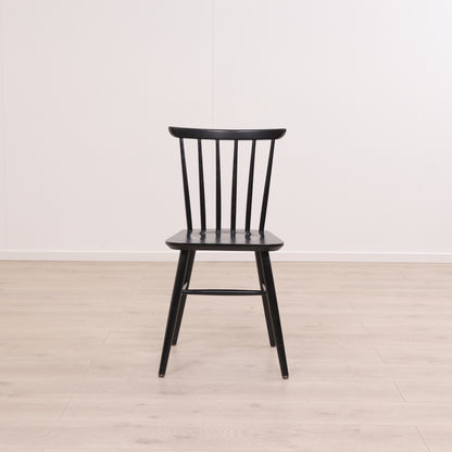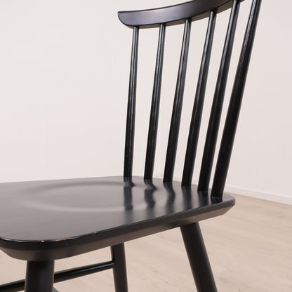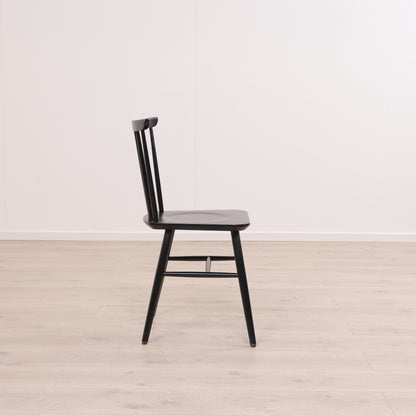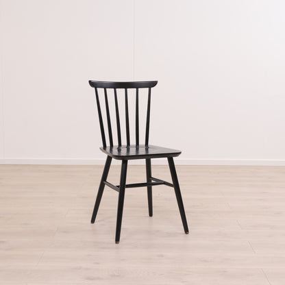 Enkel spisestol/kjøkkenstol i svart farge. En klassisk pinnestol av tre i moderne design. Stolen har en rygg med bred og luftig utforming slik at man kan sitte komfortabelt og avslappet. Med det robuste og lette trematerialet kan man enkelt flytte på stolen, noe som gjør at den fint kan plasseres i flere rom i huset. Stolen har noe bruksmerker ved kantene og på setet