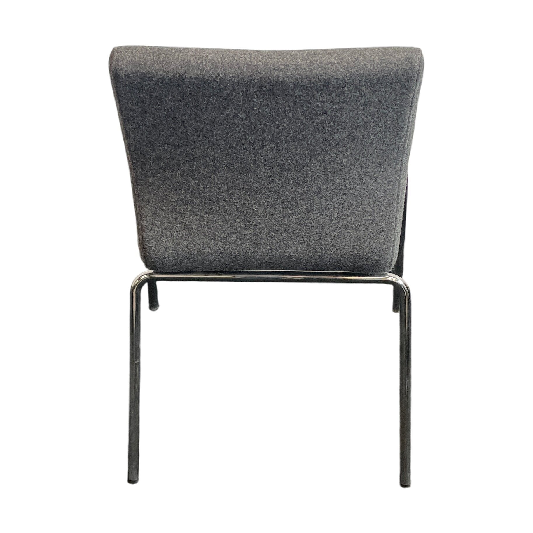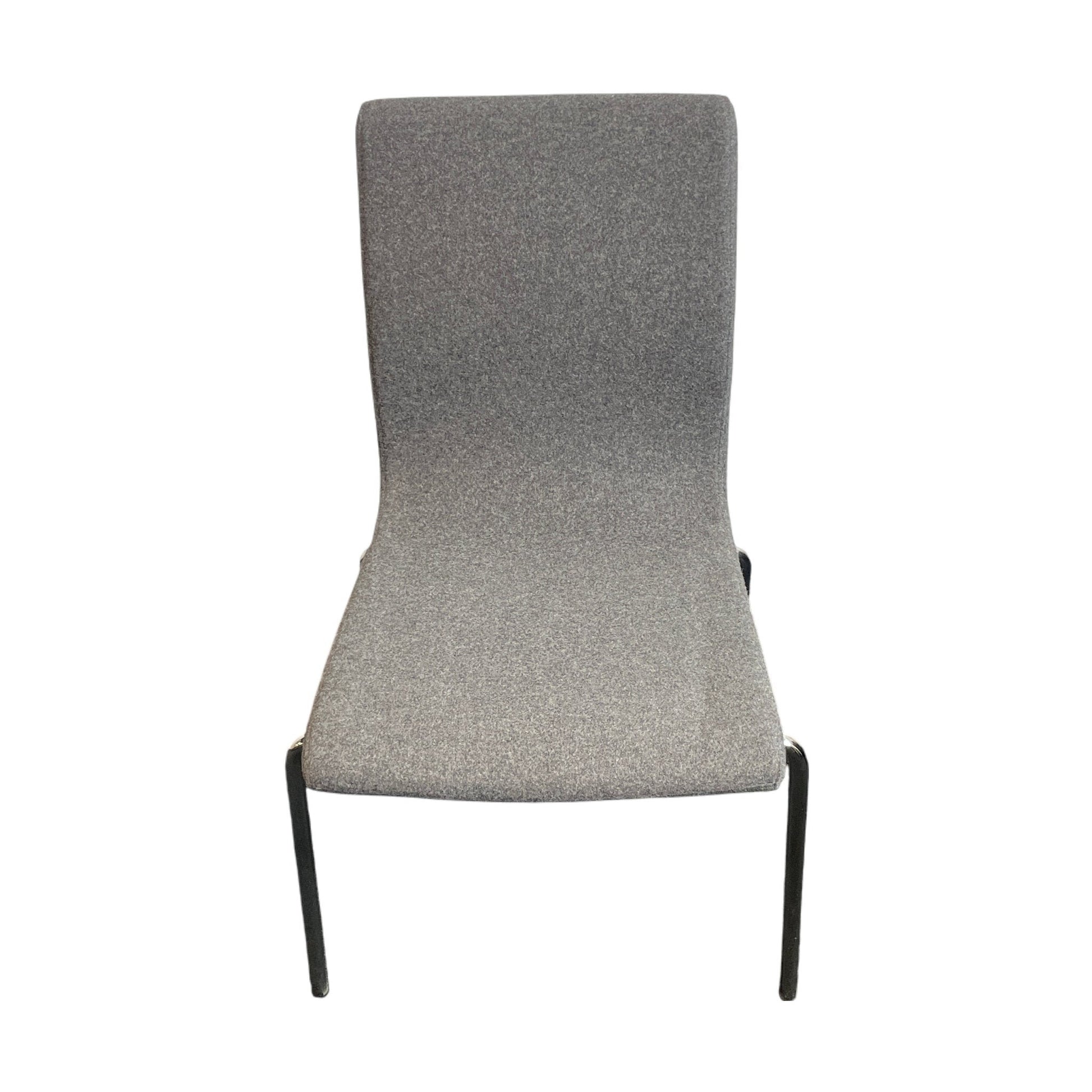 Moderne møteromsstol fra Skandiform med et stilrent design. Stolen har et polstret sete og rygg trukket i slitesterkt mørk grå ullstoff, som gir en profesjonell og elegant estetikk. Rammens minimalistiske stil i stål bidrar til stolens lette og moderne uttrykk, noe som gjør den velegnet til både møterom og kontorer.