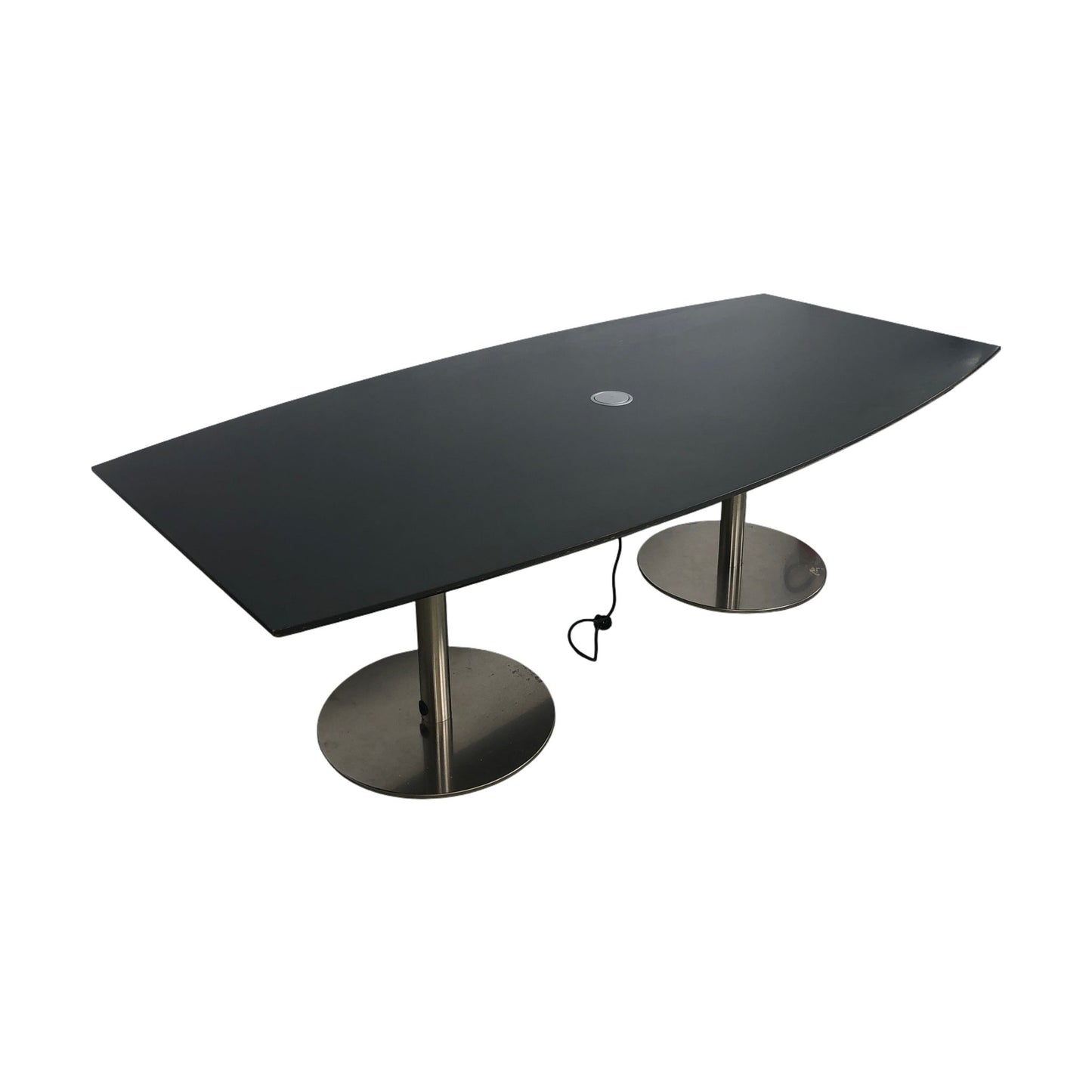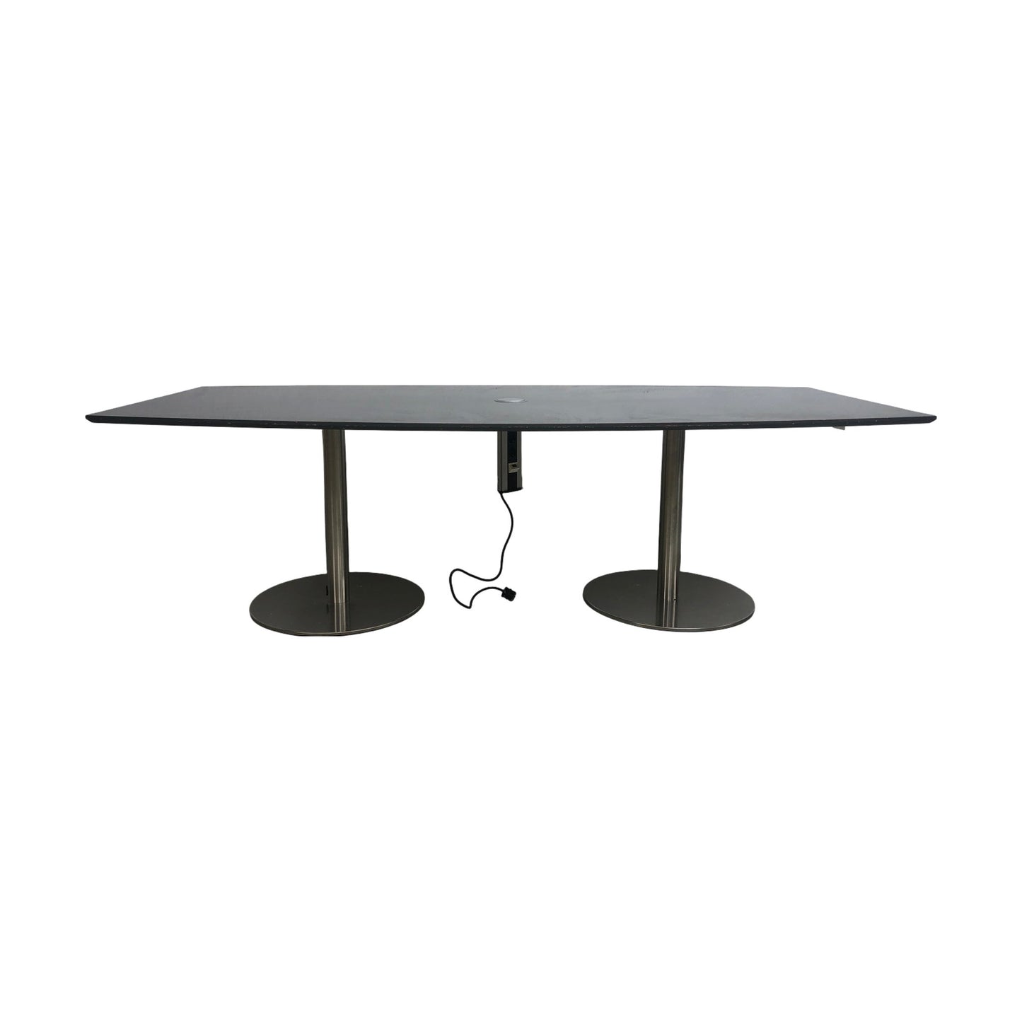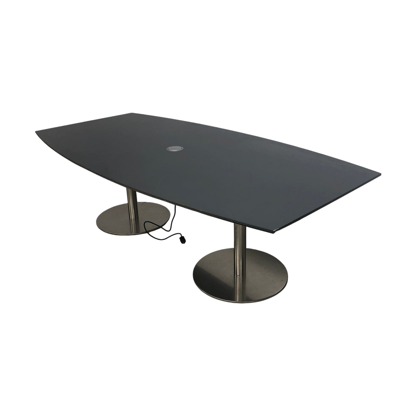 Mørke grått møtebord med et moderne og stilrent design. Bordet har en robust bordplate av tre med en classy, mørk finish, og solide metallben som gir stabilitet og støtte under møter og konferanser. En praktisk skjøteledning er elegant montert i midten av bordet, noe som bidrar til orden og tilgjengelighet av strøm ved behov. Dette bordet passer perfekt til både kontormiljøer og kreative arbeidsplasser.