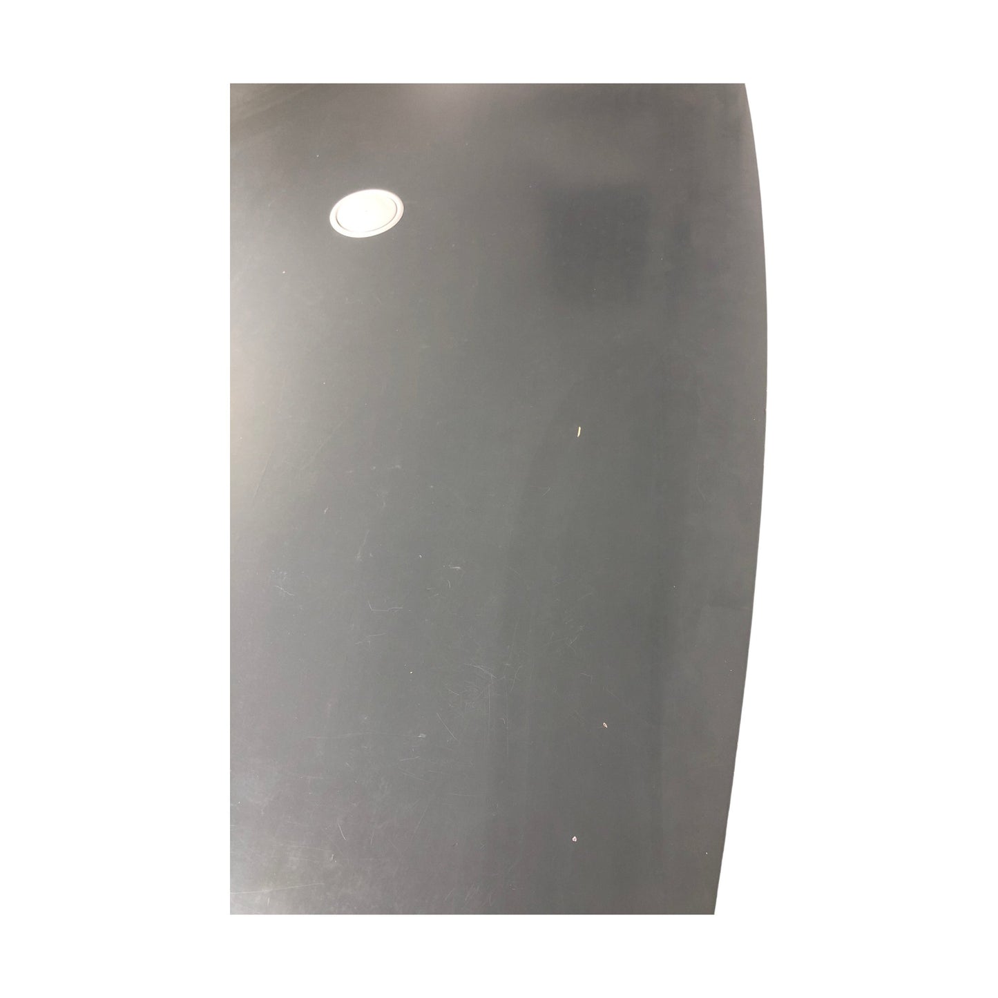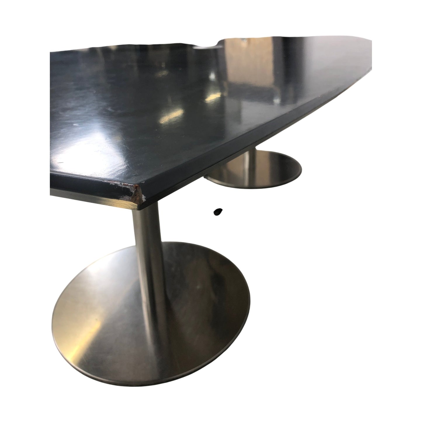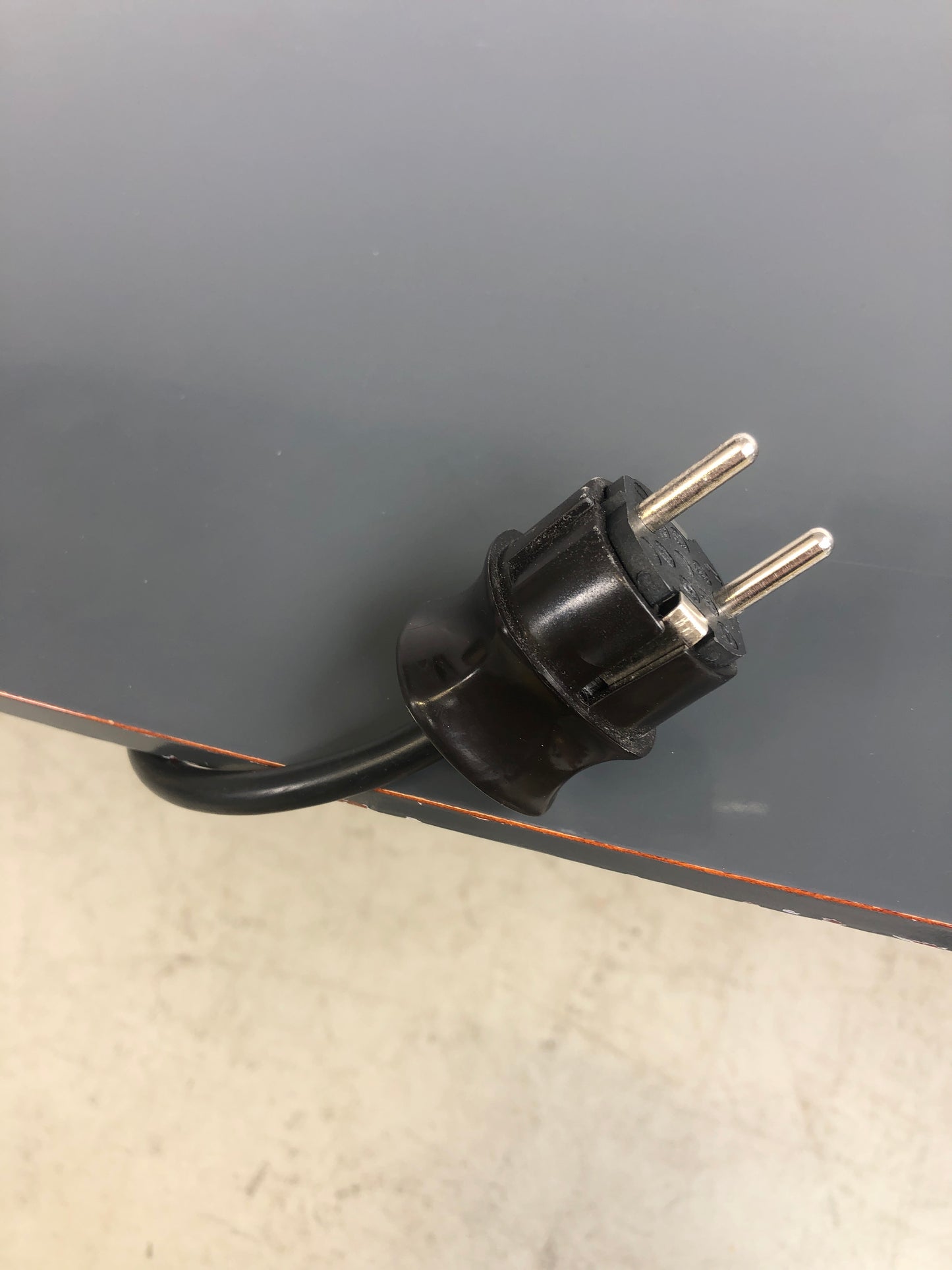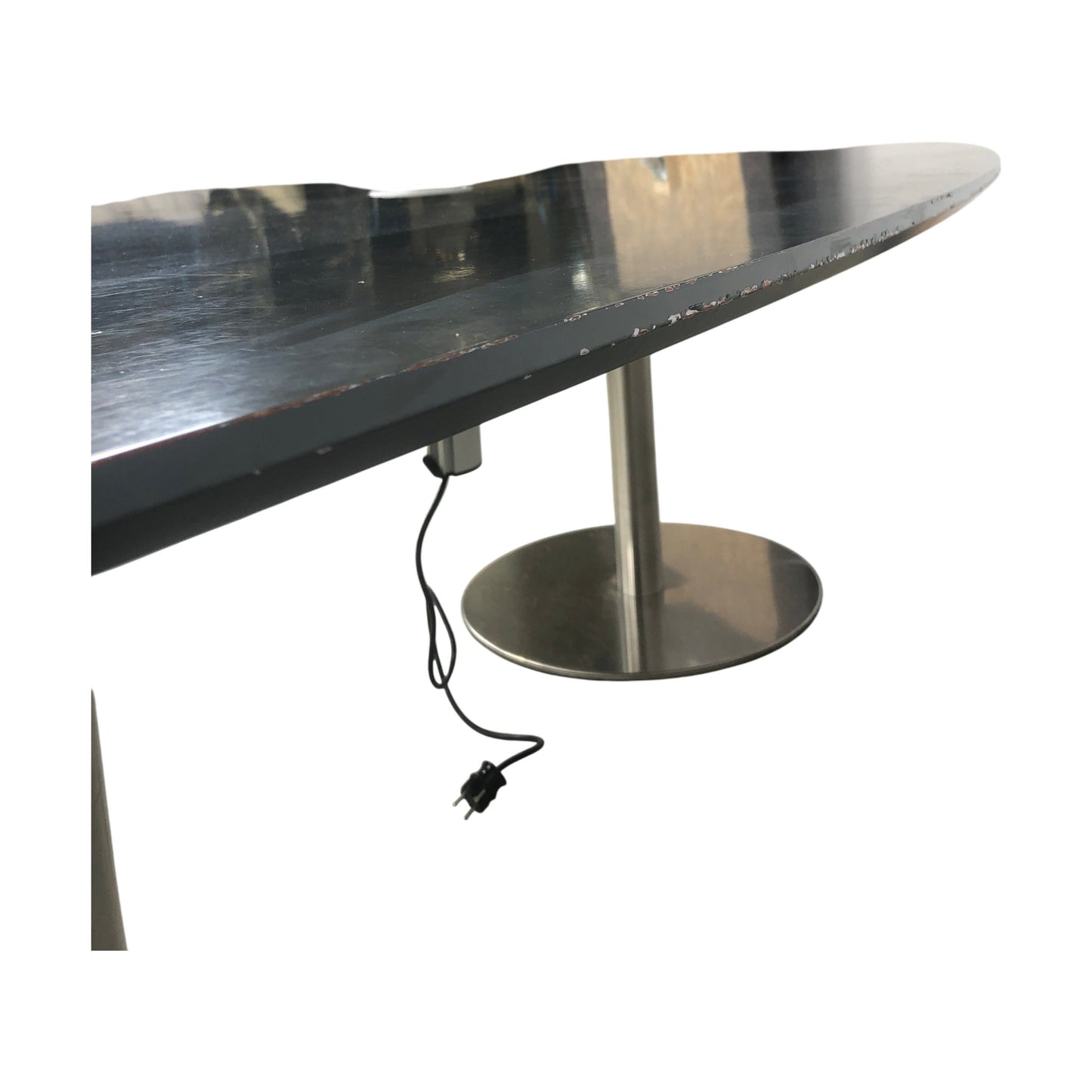 Mørke grått møtebord med et moderne og stilrent design. Bordet har en robust bordplate av tre med en classy, mørk finish, og solide metallben som gir stabilitet og støtte under møter og konferanser. En praktisk skjøteledning er elegant montert i midten av bordet, noe som bidrar til orden og tilgjengelighet av strøm ved behov. Dette bordet passer perfekt til både kontormiljøer og kreative arbeidsplasser.
