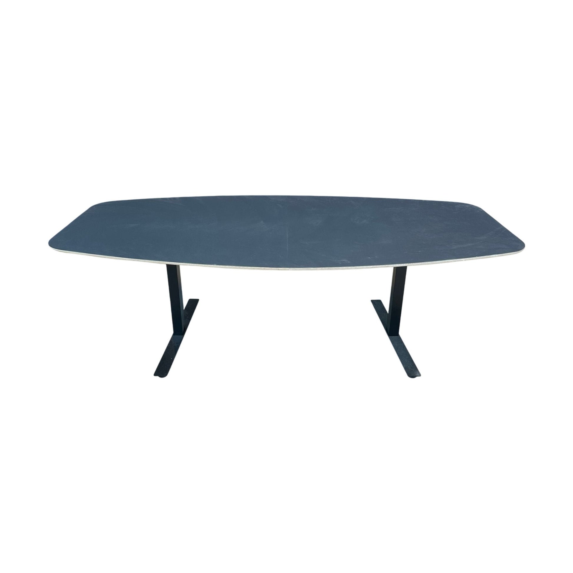 Solid møtebord med en slitesterk bordplate i svart/dueblå og et stilrent T-stativ i svart. Bordet gir et profesjonelt preg og egner seg godt i møterom, kontorer og andre arbeidsmiljøer.Den romslige bordflaten på 240x120 cm gir god plass til flere deltakere og legger til rette for effektive møter.