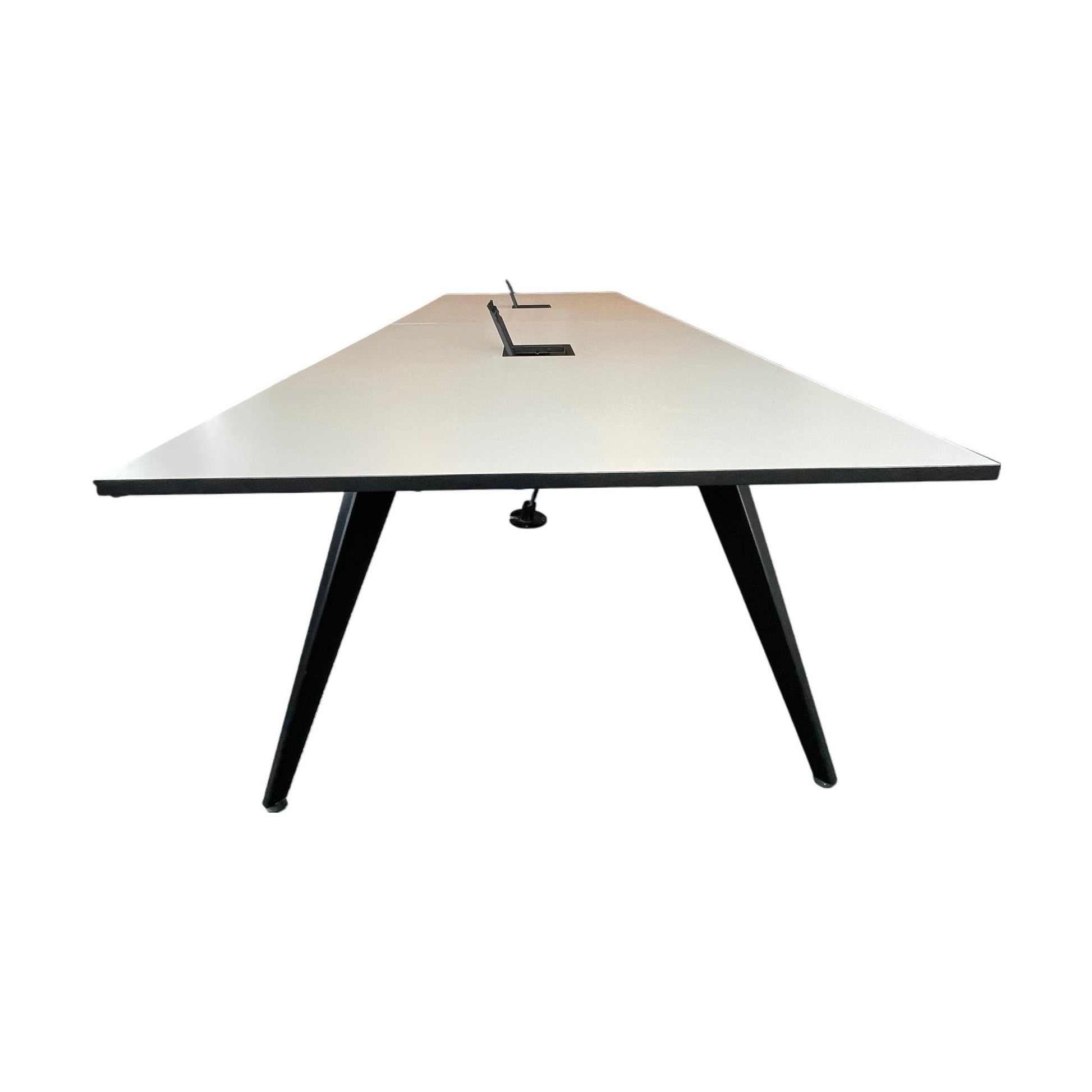 Solid møtebord med en slitesterk hvit laminat bordplate og sorte kryssbein. Bordet har integrerte kabelbrønner for enkel tilkobling av utstyr, noe som gir det et moderne og funksjonelt preg. Den stilrene designen gjør dette bordet egnet for møterom, kontorer og arbeidsmiljøer.