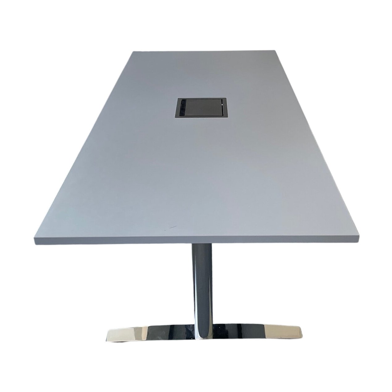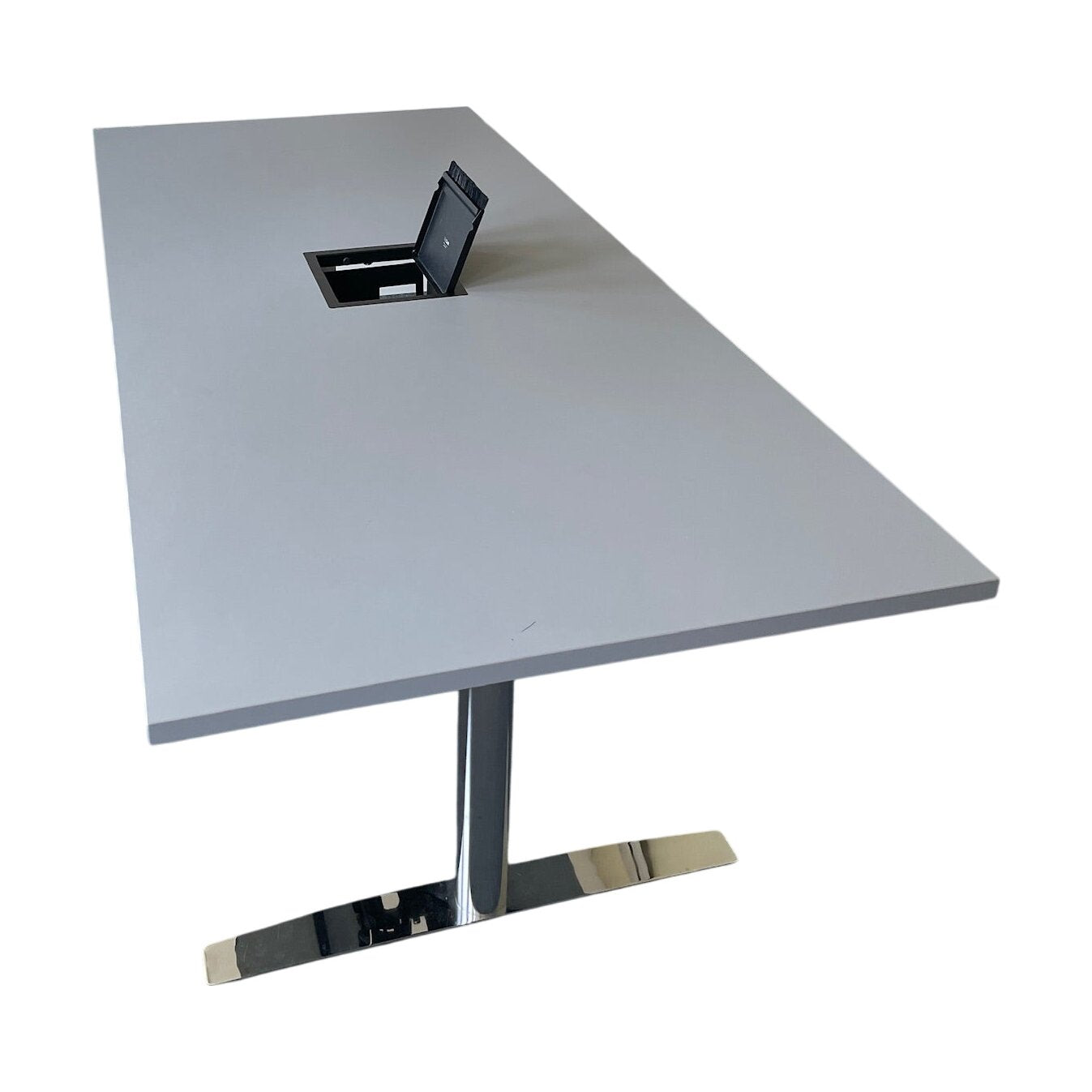 Møtebord med en stilren grå bordplate og en integrert kabelluke for effektivisering av møteopplevelser. Bordets moderne design gjør det ideelt for møterom, kontorer og ulike arbeidsmiljøer.
