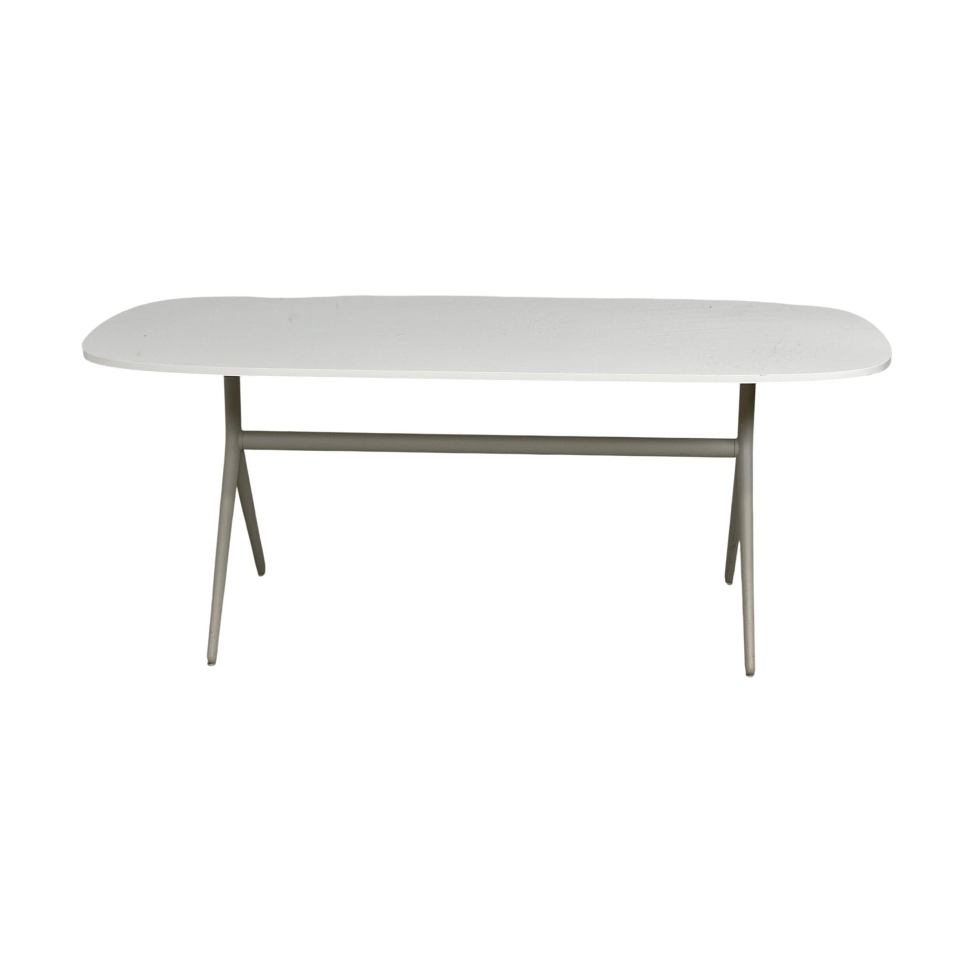Solid møtebord med en slitesterk hvit laminat bordplate og et understell i metall. Bordet har en stilren design med myke former og avrundede kanter, og passer utmerket inn i møterom, kontorer og andre arbeidsmiljøer.