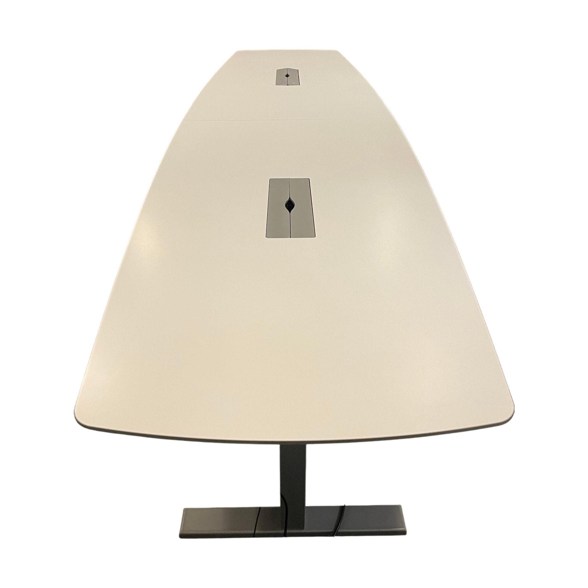 Solid møtebord med en slitesterk hvit laminat bordplate og et moderne understell i svart stål. Bordet har en elegant, buet form som gir en luftig følelse, perfekt for møterom og kontorer.