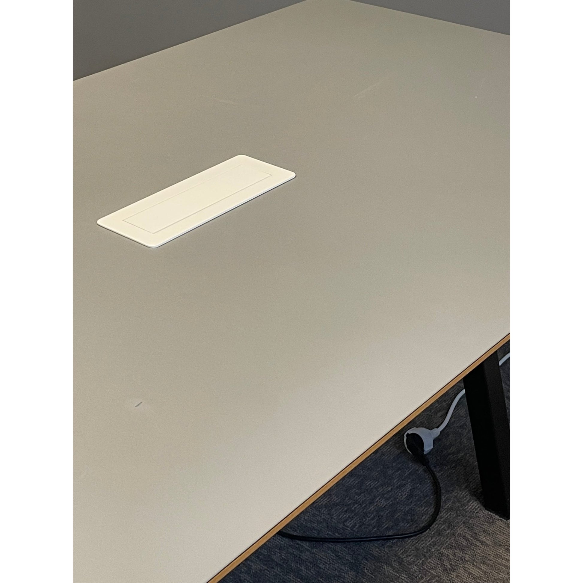 Bordet er i god tilstand og har noen synlige bruksmerker, men helhetsinntrykket er fortsatt godt, og bordet er fullt funksjonelt til møte- og kontorbruk.