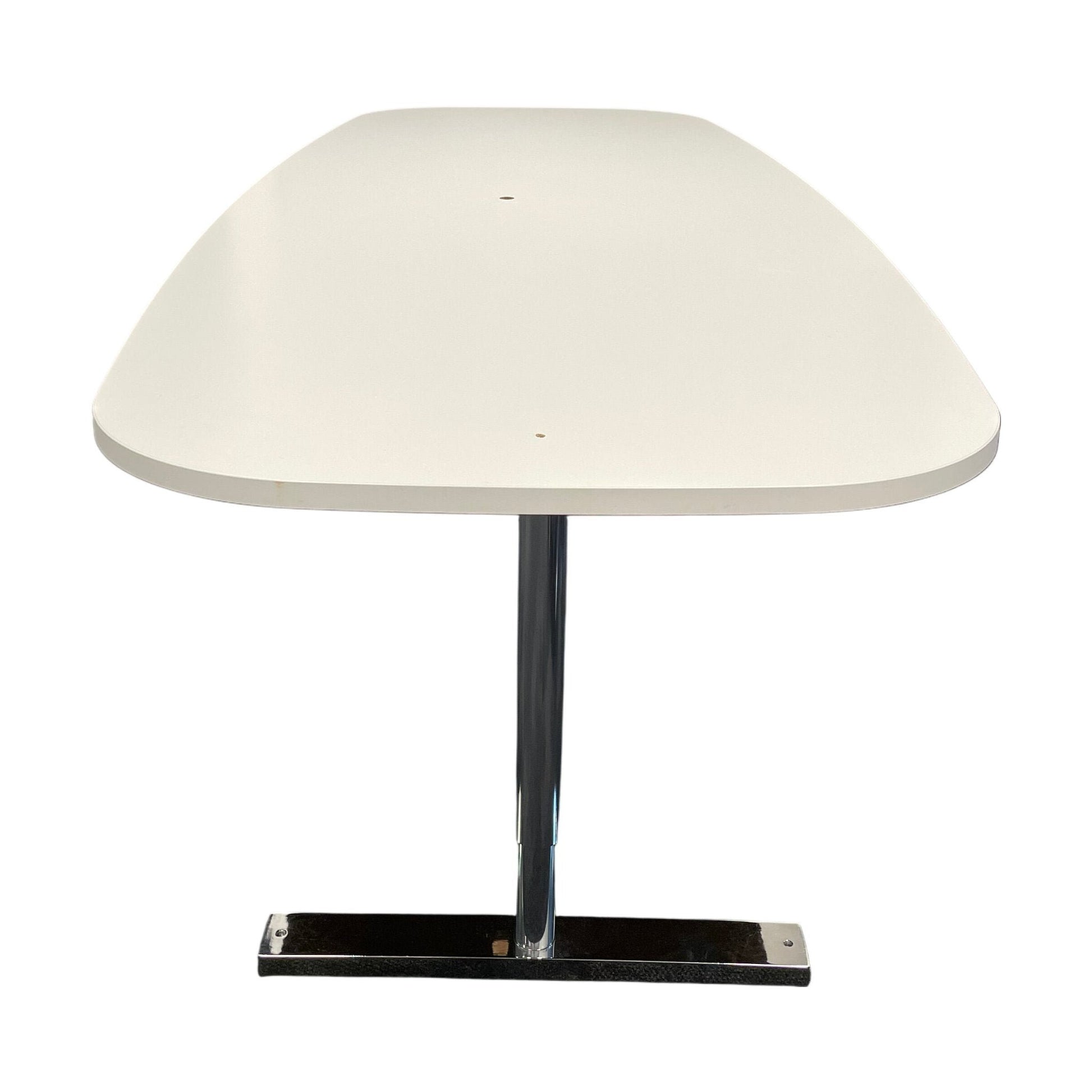Solid møtebord med en slitesterk hvit ovalt bordplate og krom ben. Bordet har integrerte hull for AV-utstyr, noe som gjør det ideelt for moderne møterom. Den stilrene formen og den elegante finishen gir et profesjonelt preg, perfekt for kontorer og møterom.