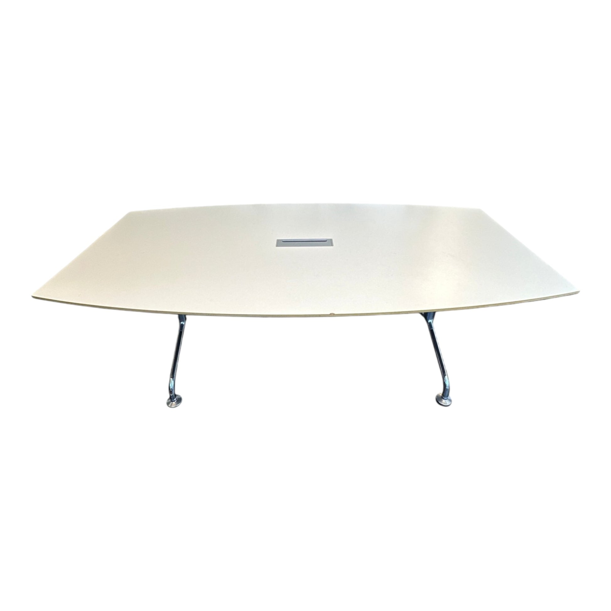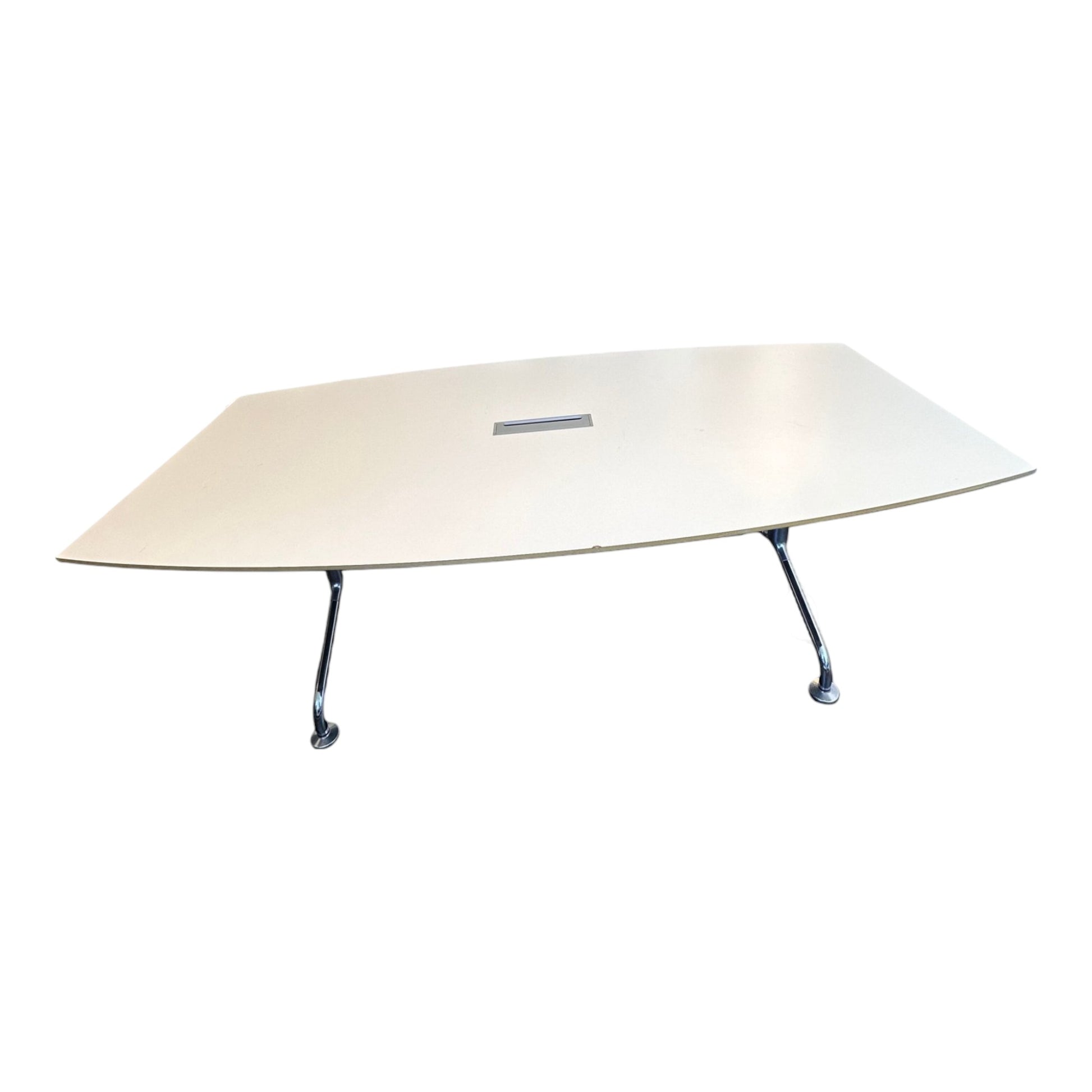 Praktisk møtebord med en hvit laminat bordplate som gir et moderne og stilrent uttrykk. Bordet er utstyrt med en solid metallramme som sikrer stabilitet og langvarig bruk. Den romslige bordflaten på 210x110 cm gir god plass til møter og samarbeid.