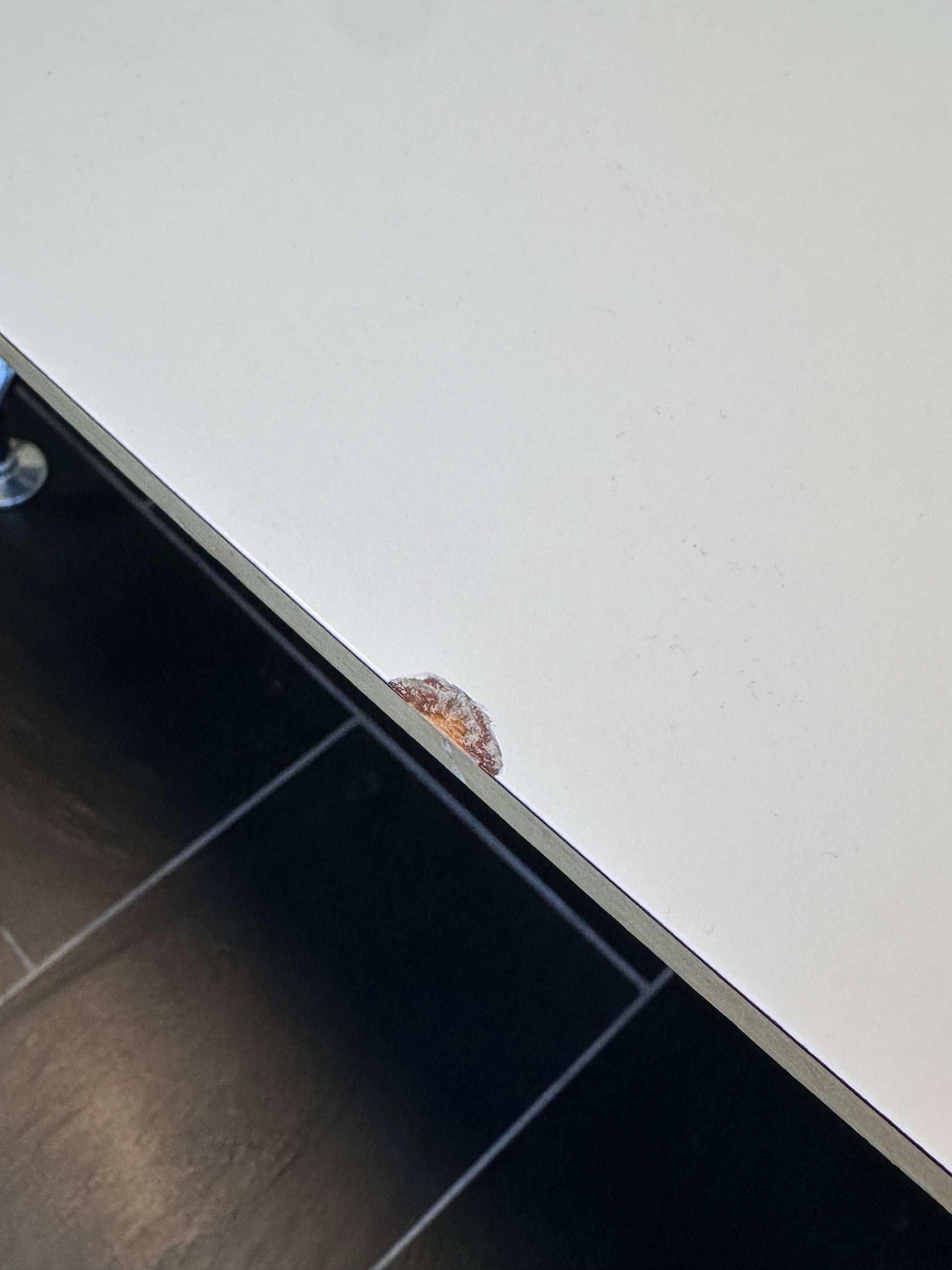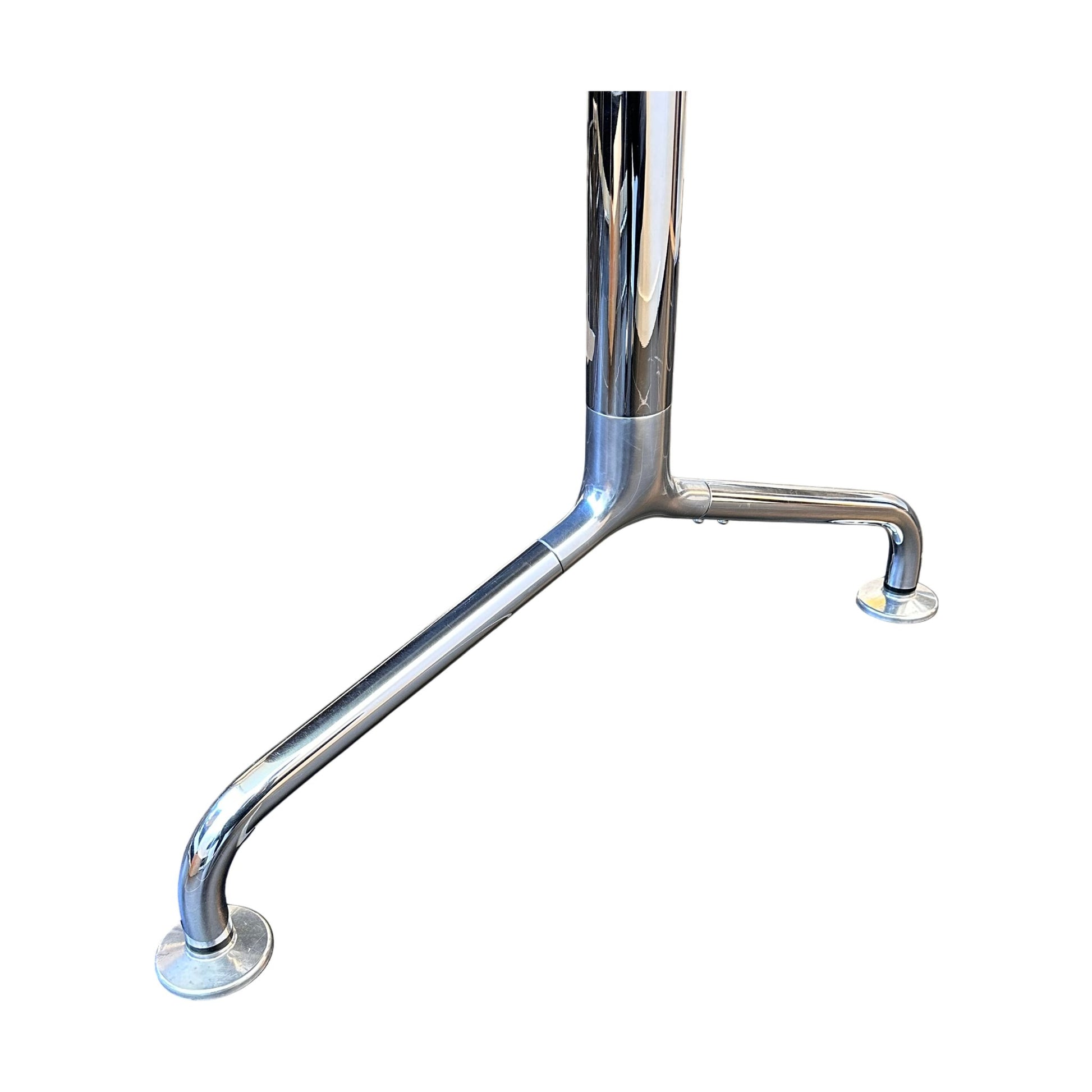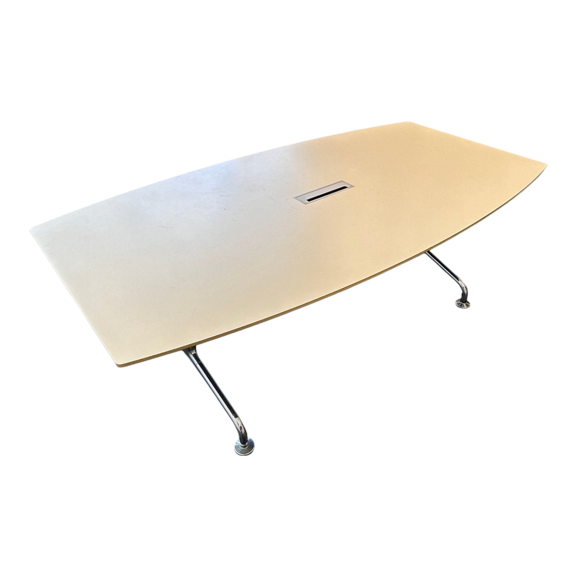 Bordet har noen merker i bordplaten, samt et markant hakk langs den ene kanten, men er fortsatt fullt funksjonelt og egner seg godt til møter og kontorbruk.