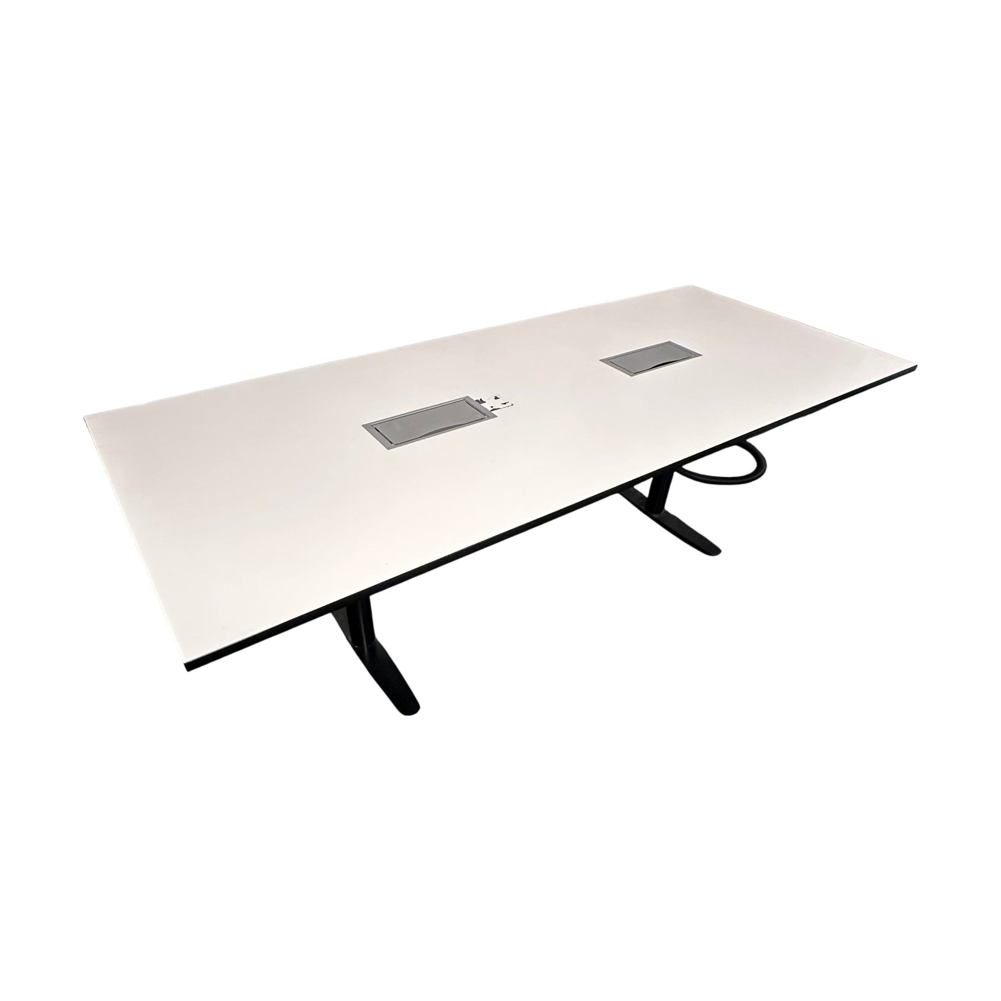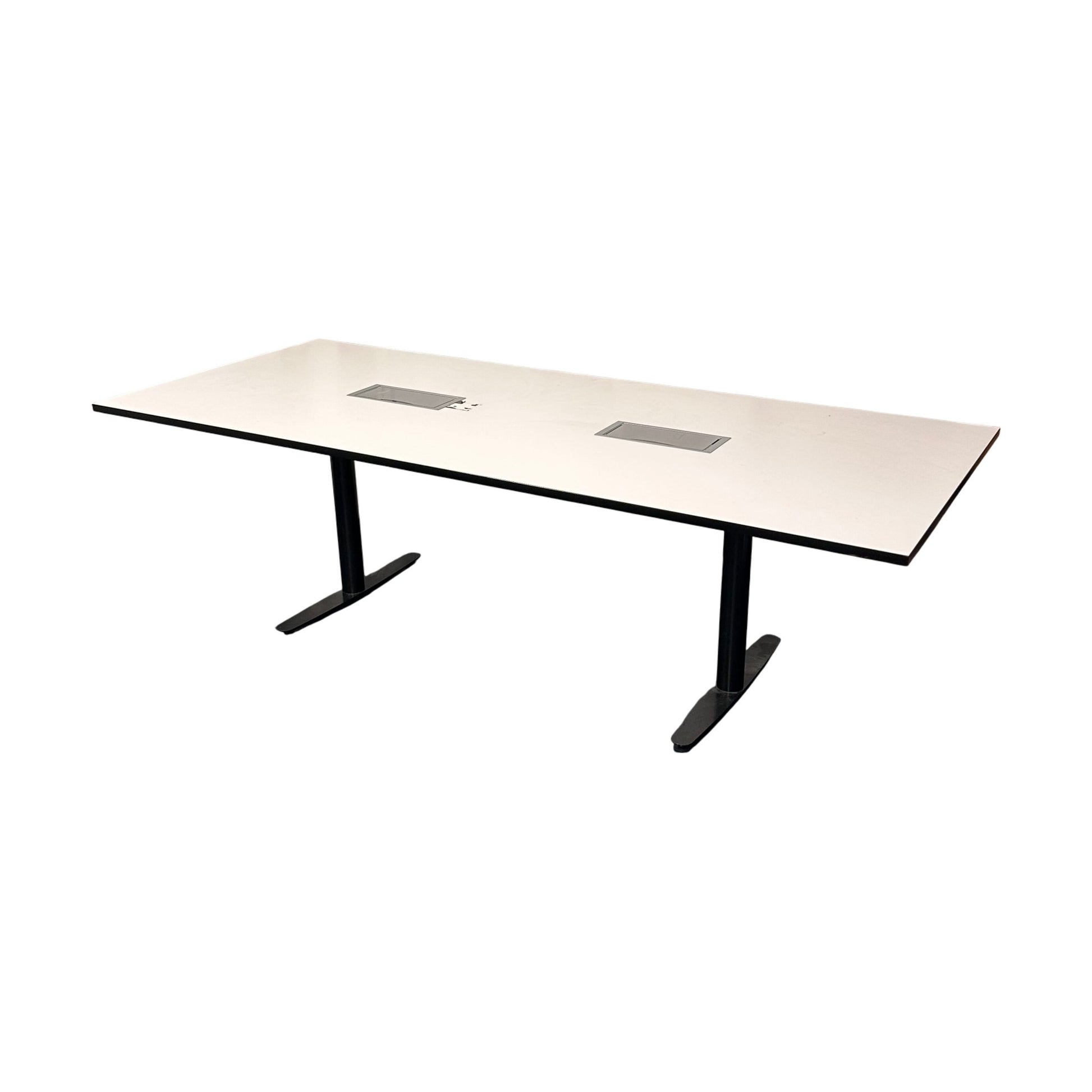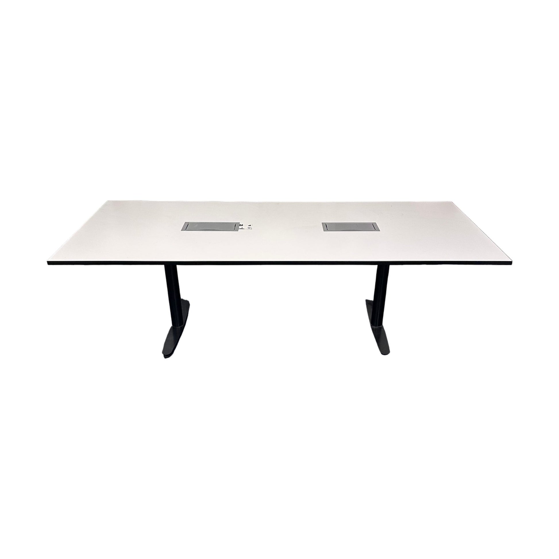 Elegant møtebord med en romslig bordflate i hvit laminat. Bordet har en moderne stil med sorte ben, og gir et profesjonelt preg som passer perfekt til møterom og kontoromgivelser. Den generøse størrelsen på 240x100 cm gir god plass til flere deltakere, og de integrerte stikkontaktene gjør det enkelt å koble til elektronisk utstyr.