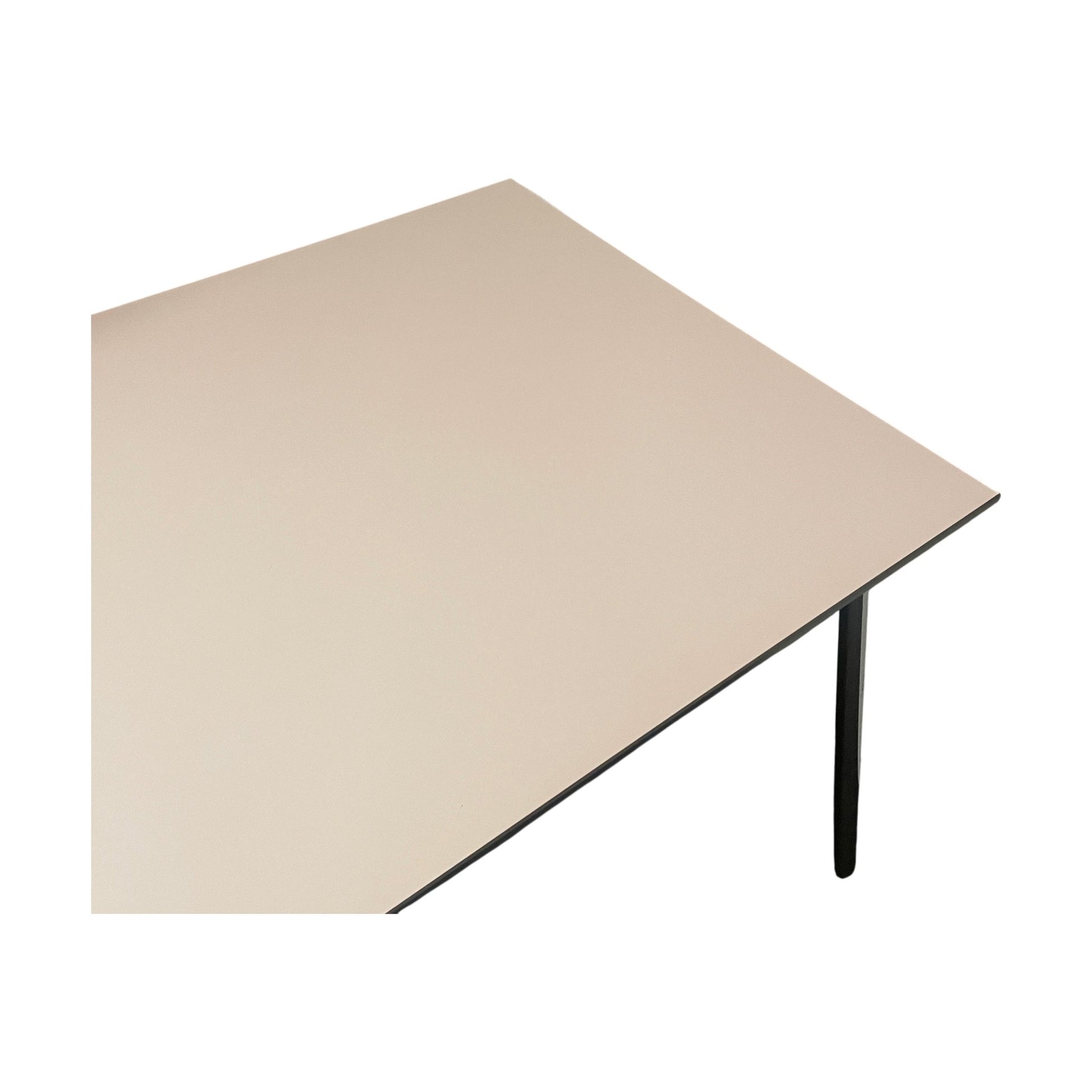 Dette møtebordet har en elegant hvit overflate med en sofistikert grå kant. Bena i krum gir en spesiell estetikk, perfekt for å skape et behagelig og inspirerende arbeidsmiljø.