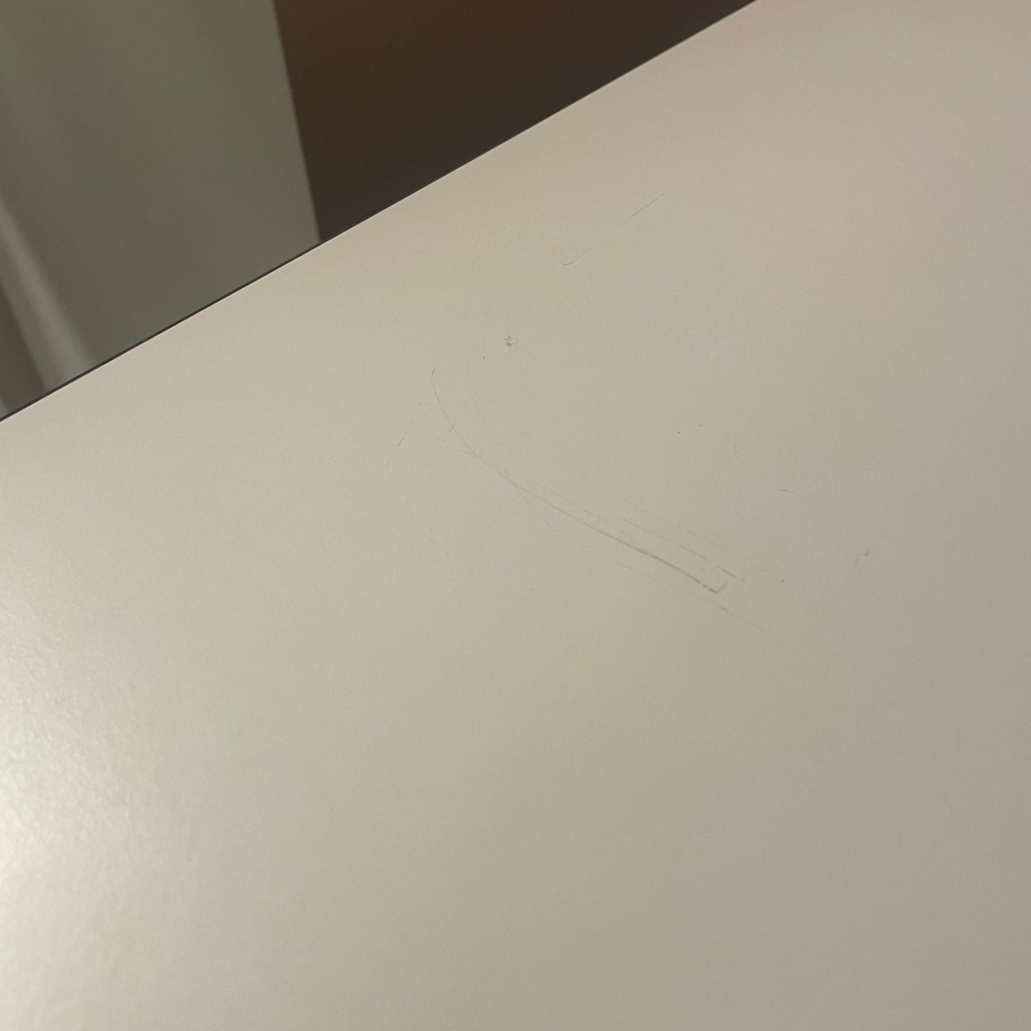 Bordet har en liten ripe på overflaten, men dette har ingen innvirkning på bordets funksjonalitet. Med sitt stilige design er dette bordet fortsatt et flott valg for kontoret.