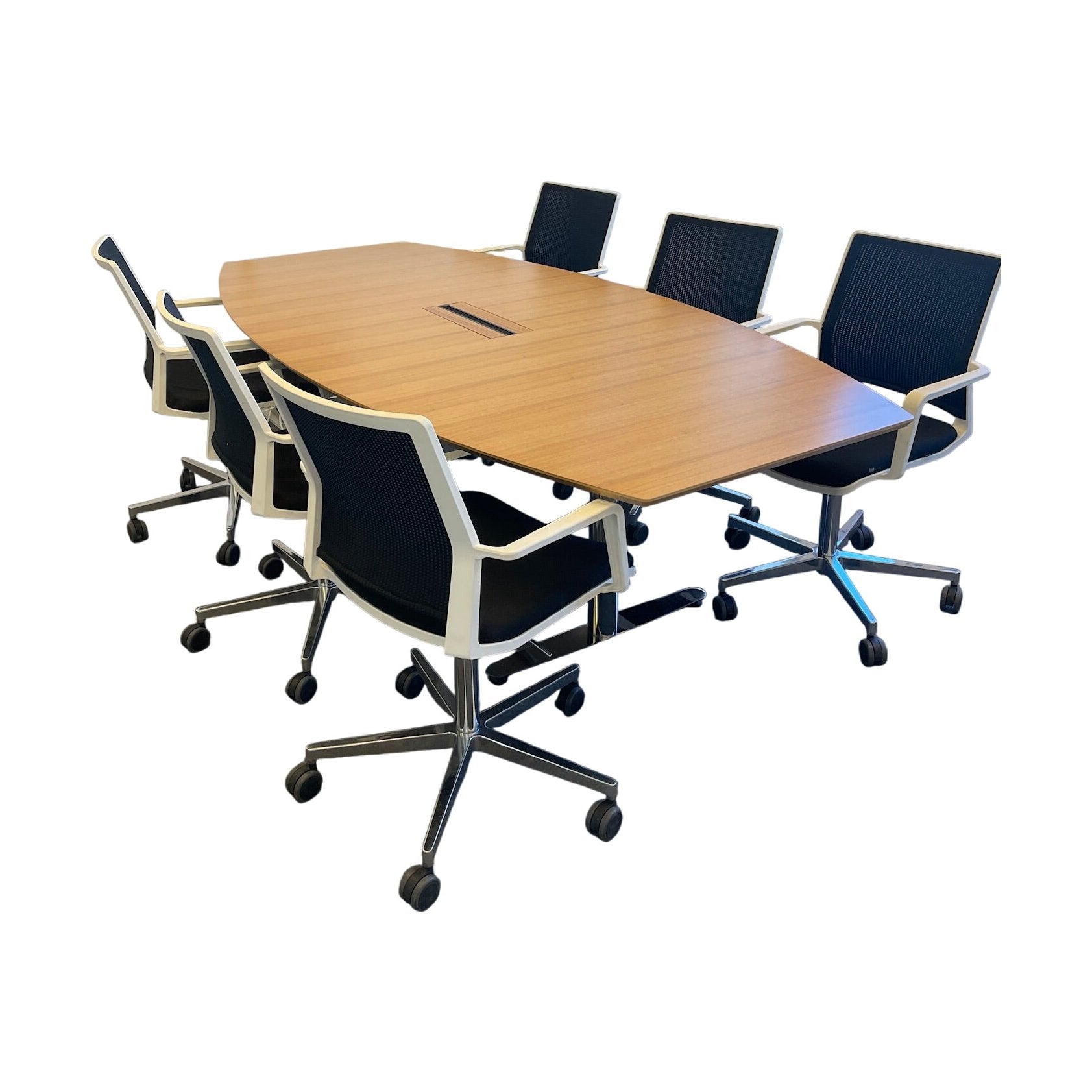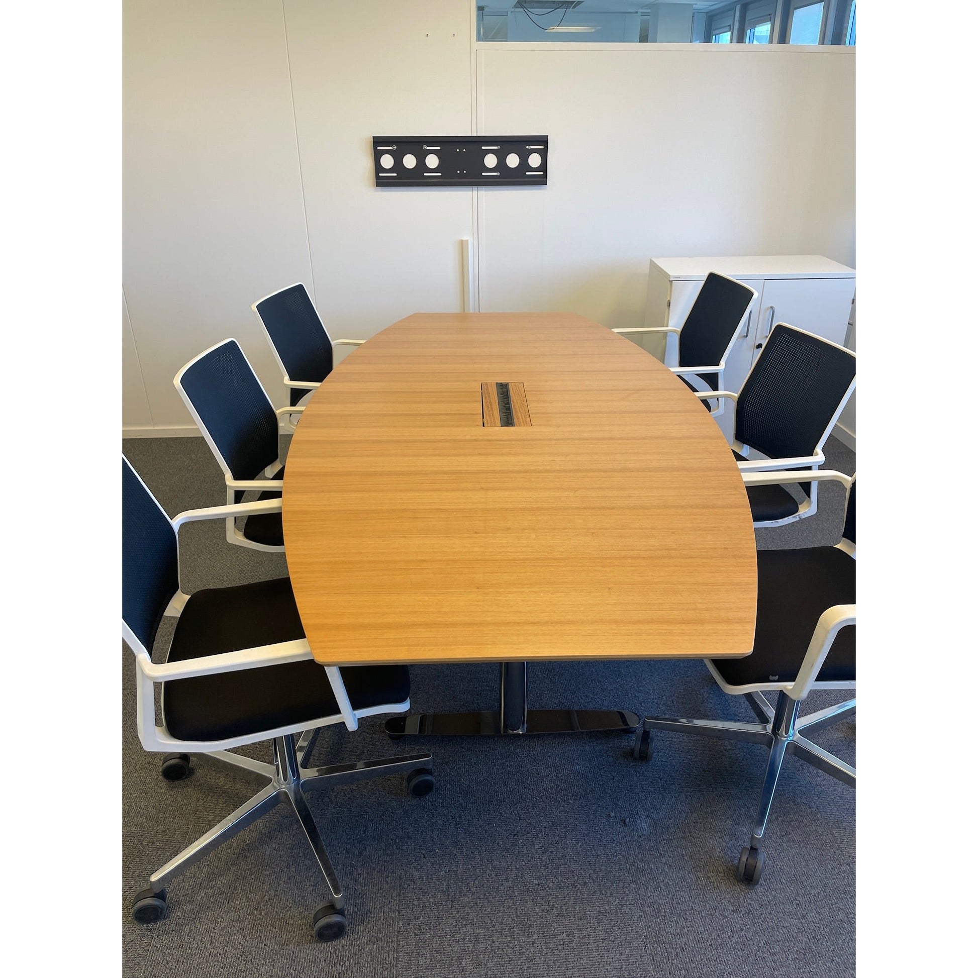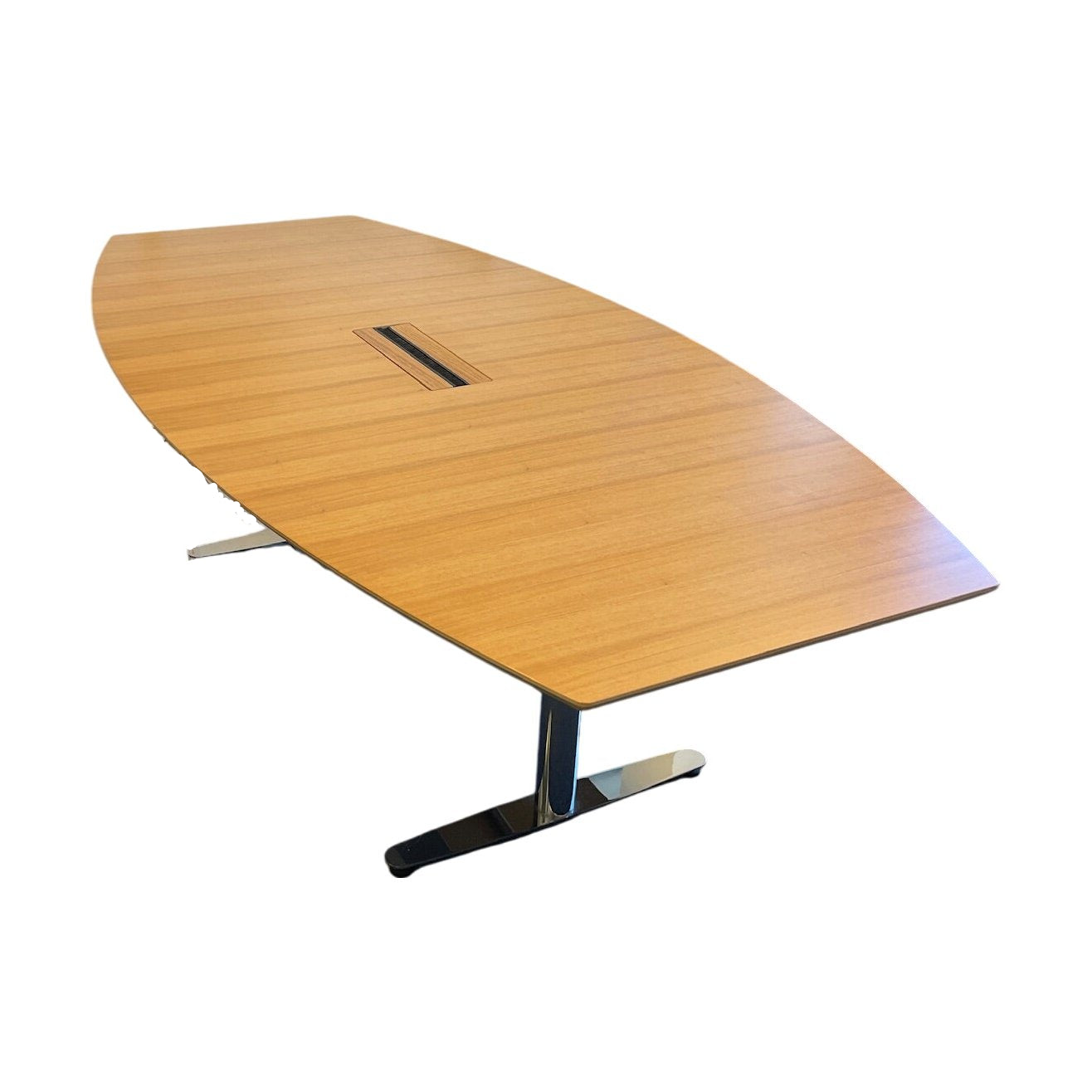 Solid møtebord med en elegant oljet eik bordplate som gir et varmt og profesjonelt utseende. Bordets avrundede kanter og stilige linjer kombinert med et robust understell i krom gir et moderne preg, ideelt for møterom, kontorer og samarbeidssituasjoner.