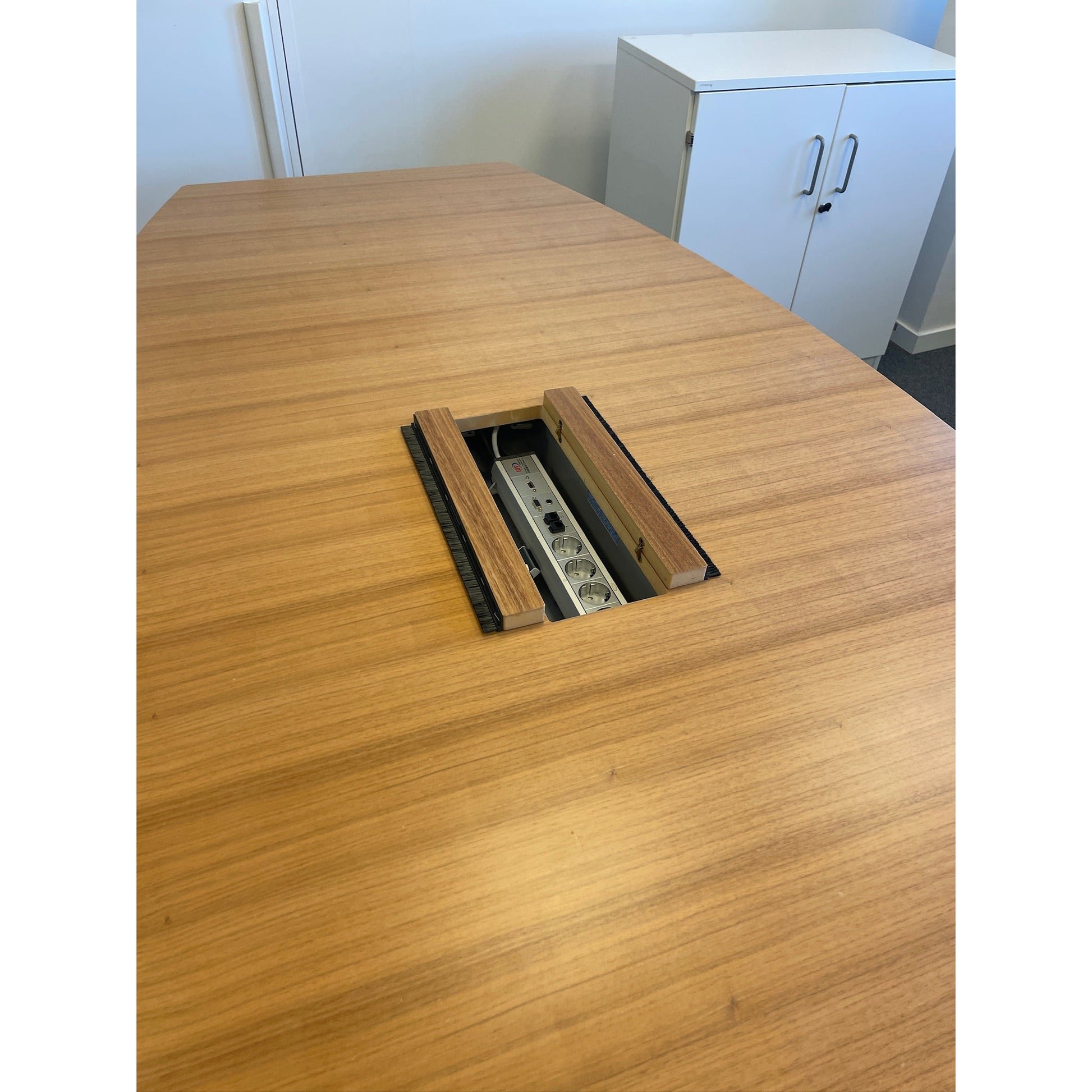 Bordet er i utmerket tilstand med minimale bruksmerker, som ikke går utover helhetsinntrykket. Det er fullt funksjonelt og klart for bruk i møte- og kontormiljø.