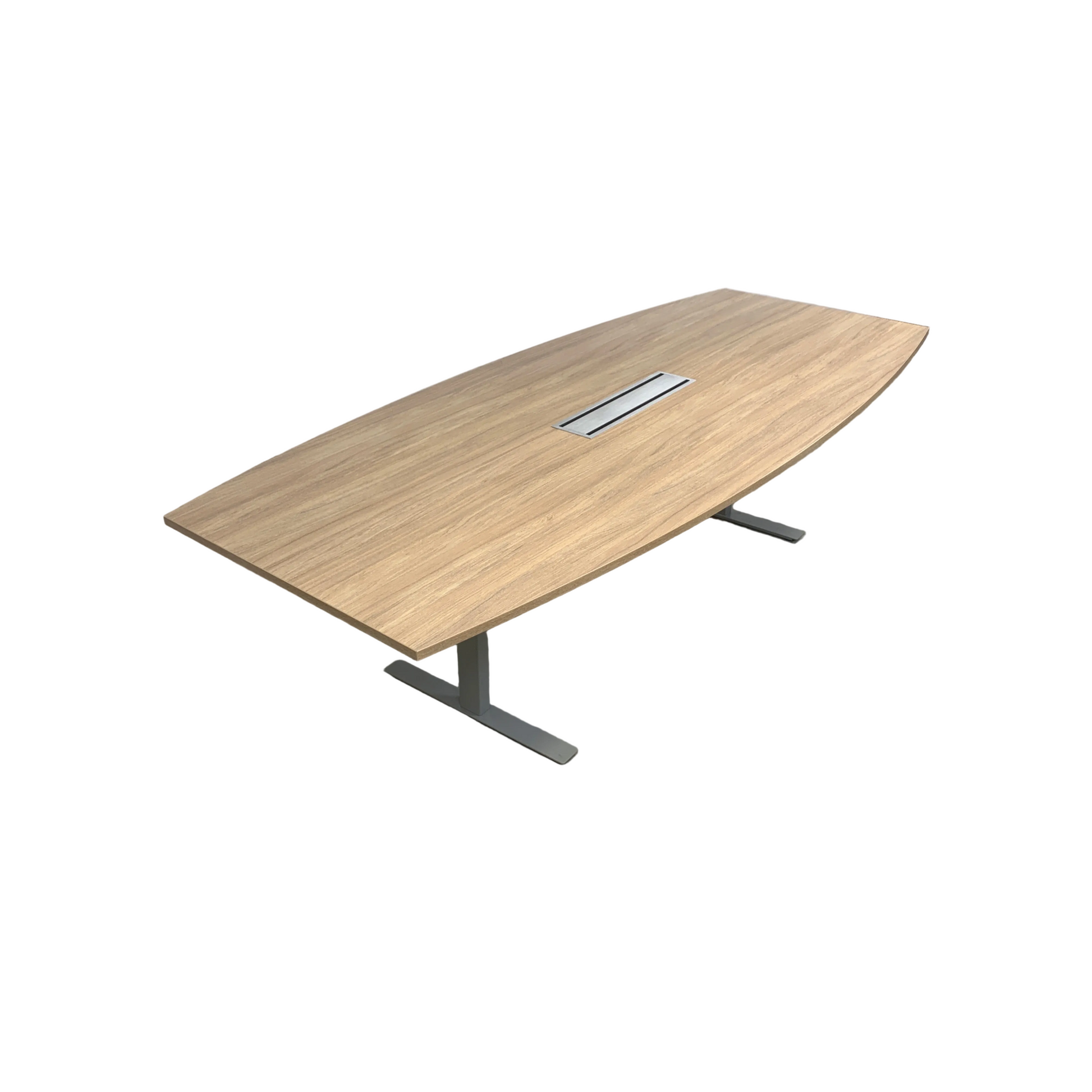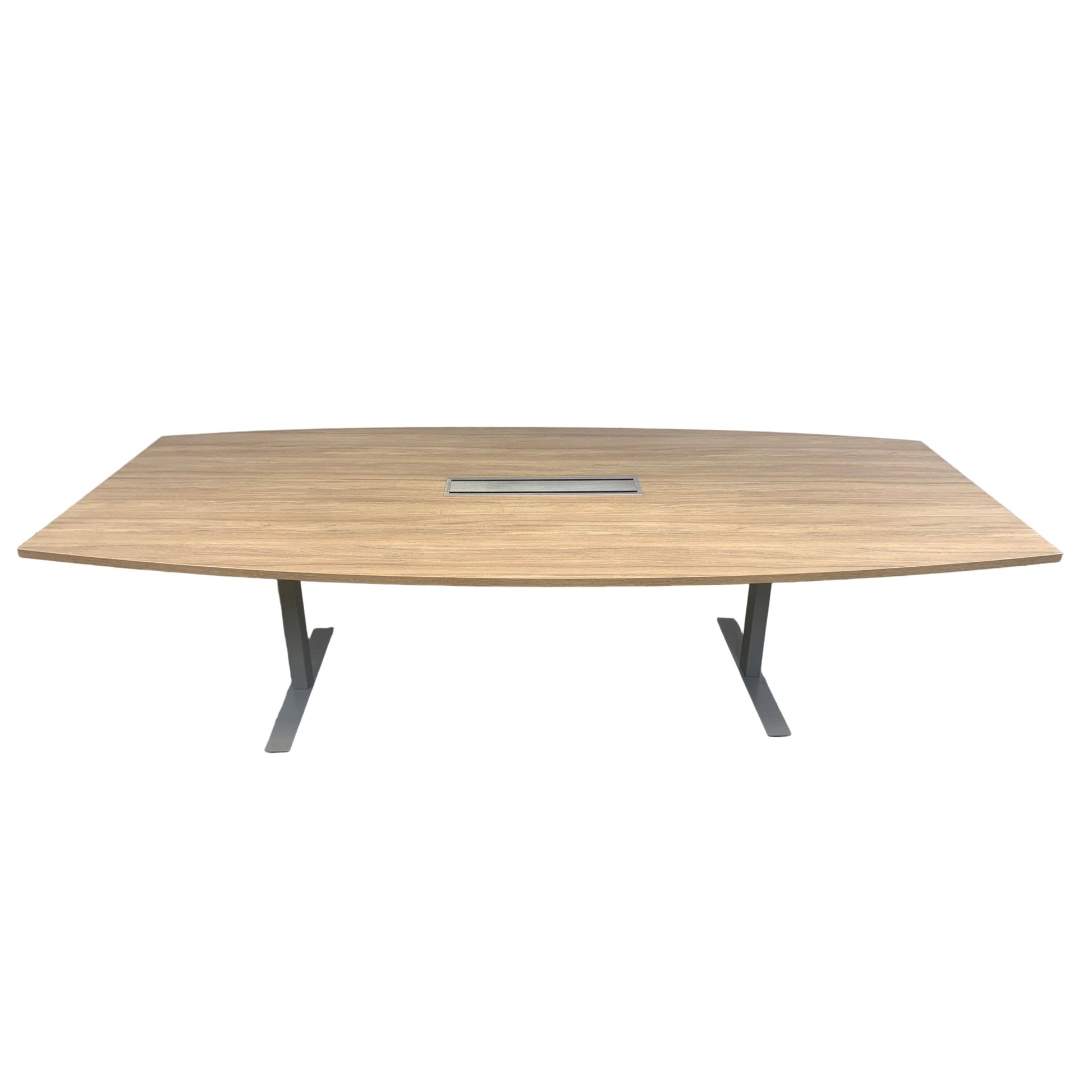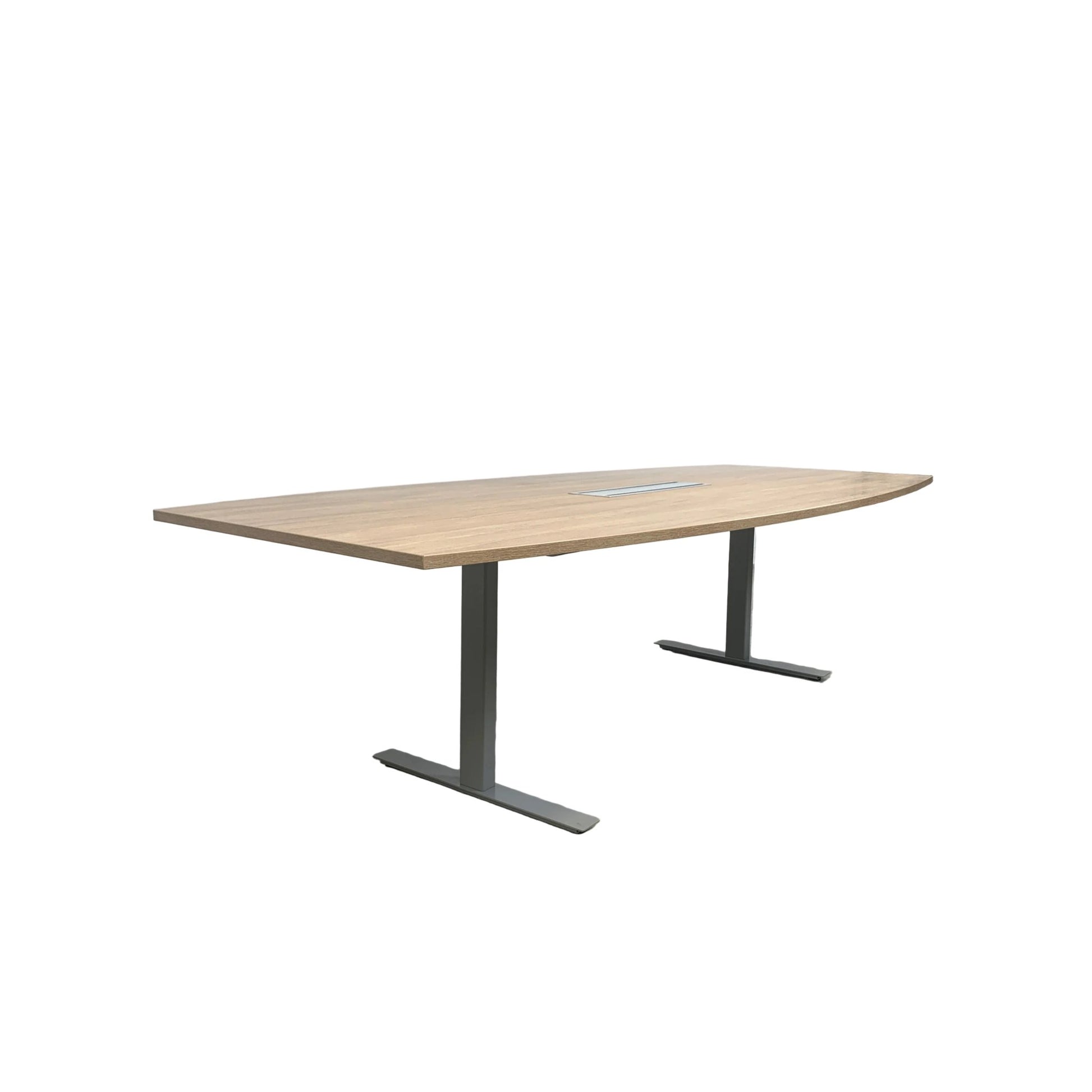 Solid møtebord med en slitesterk trefarget lys eik bordplate og et understell i grå metall. Bordet gir et stilrent og moderne preg, og egner seg godt i møterom, kontorer og andre arbeidsmiljøer.