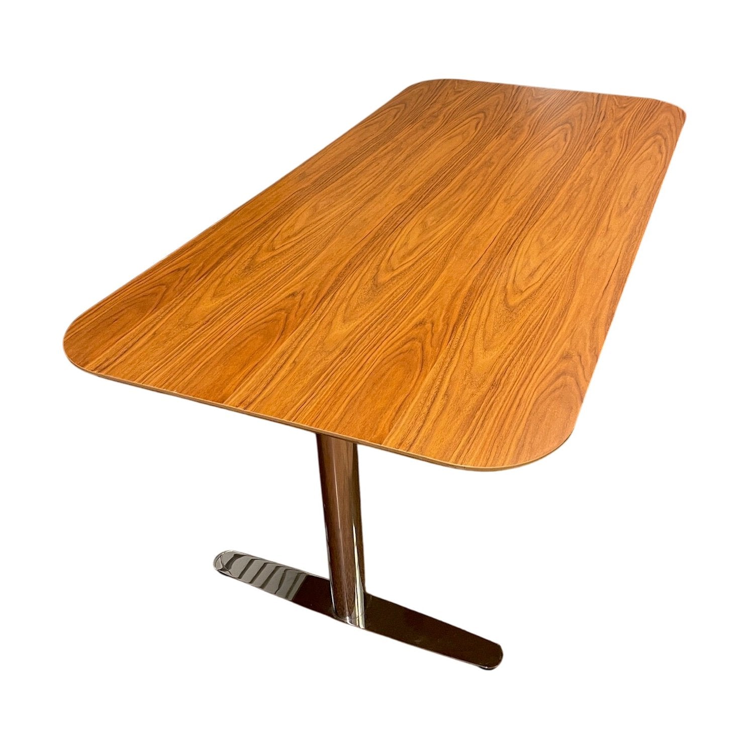 Solid møtebord med en elegant valnøtt-finish bordplate og avrundede hjørner, som gir et mykt og innbydende preg. Det stilrene designet passer perfekt i møterom, kontorer og andre arbeidsmiljøer.