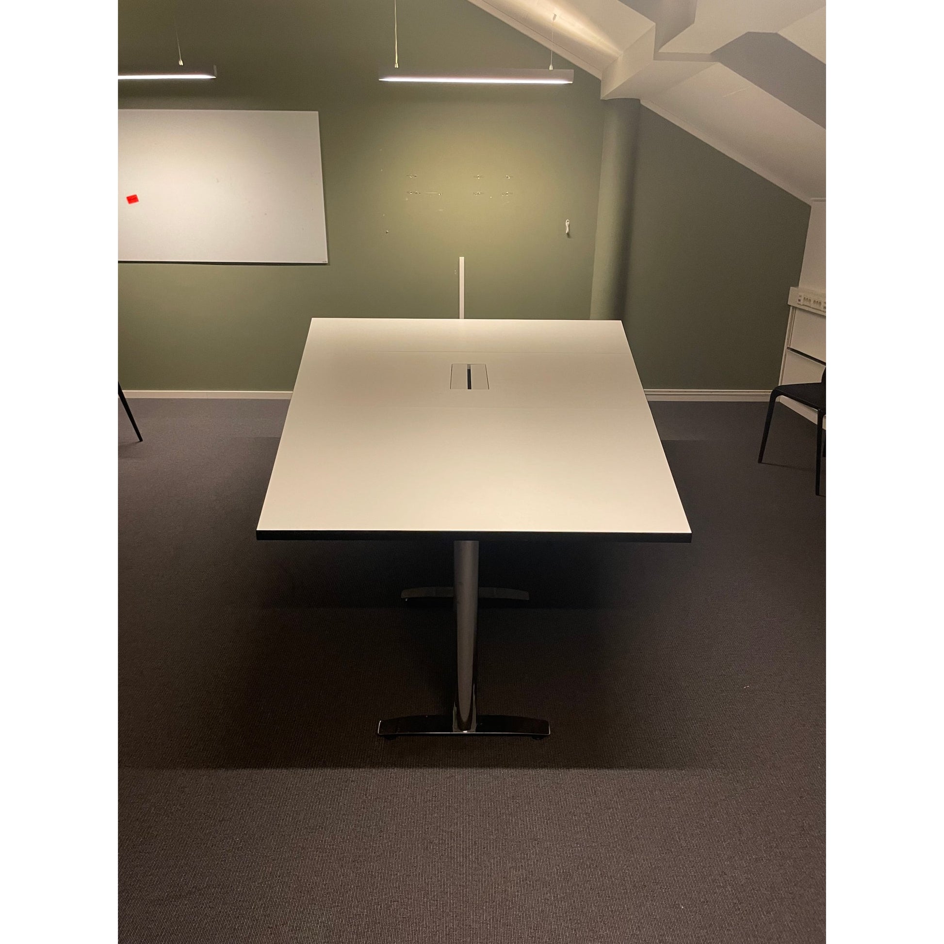 Solid møtebord med en slitesterk hvit bordplate i trapesform, bestående av tre deler. Bordet gir et stilrent og moderne preg, og egner seg godt i møterom, kontorer og andre arbeidsmiljøer.
