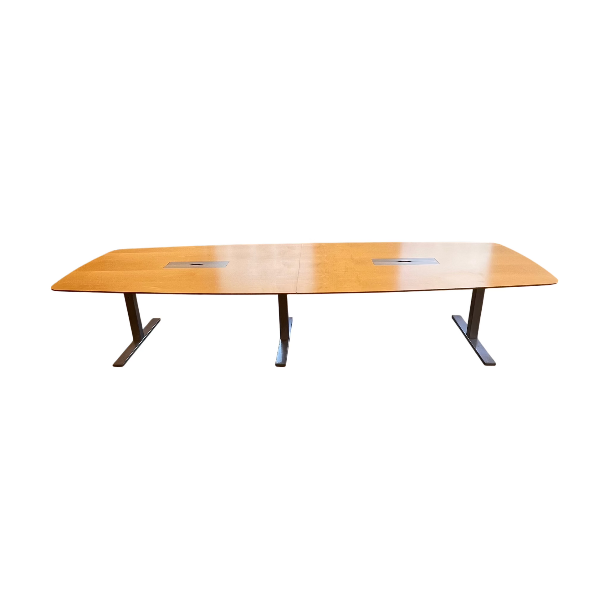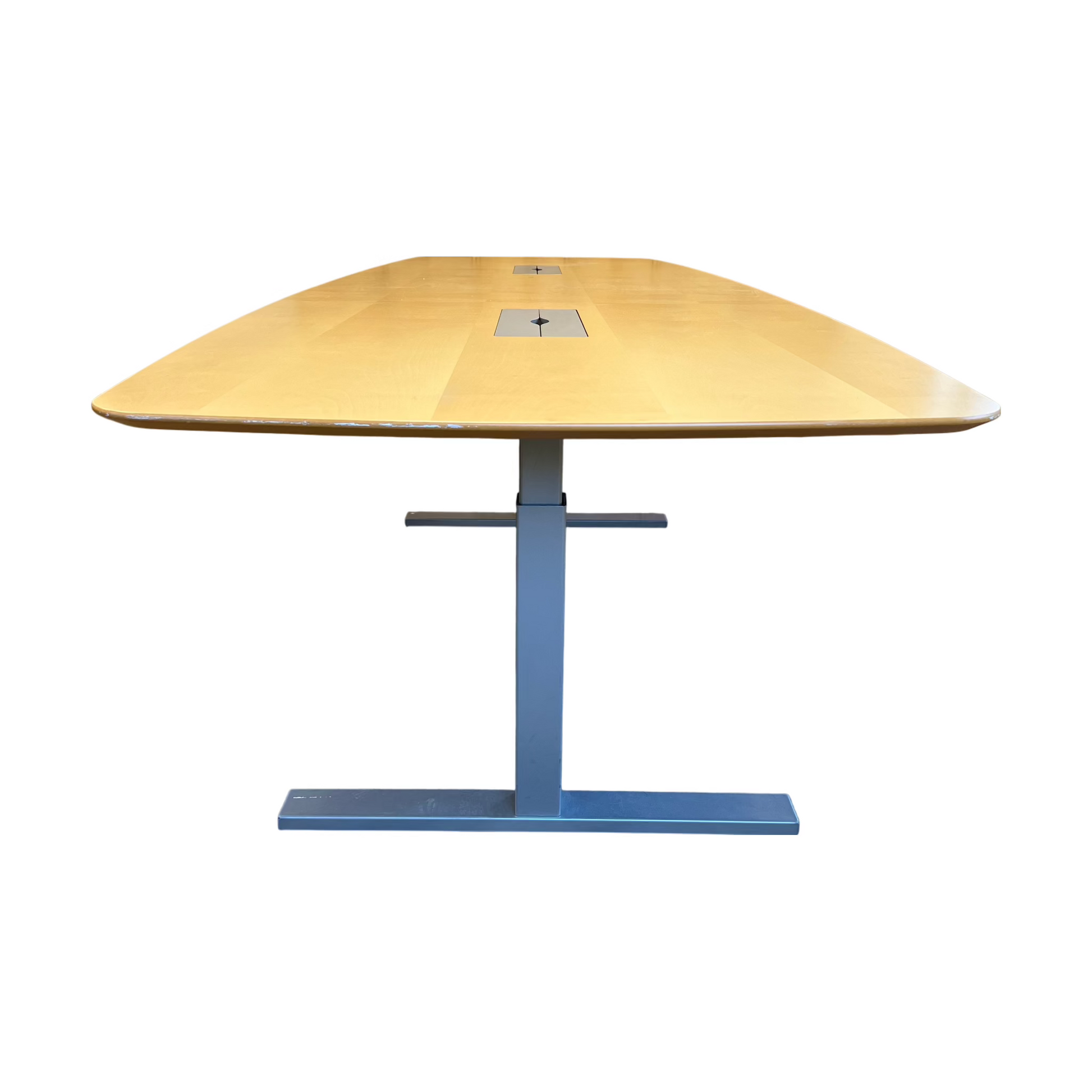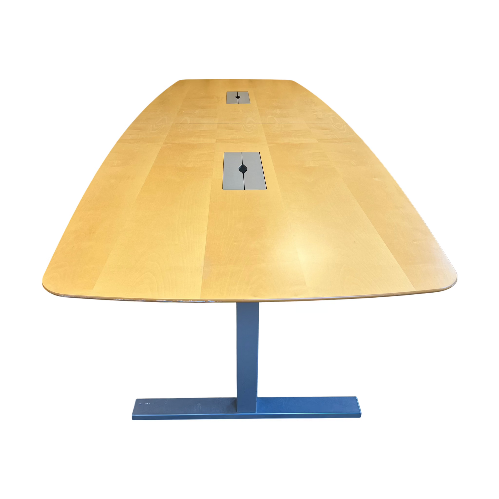 Båtformet møtebord i en praktisk trefarge. Dette bordet gir en interessant og innbydende atmosfære til møter, og tilbyr rikelig plass for diskusjoner og samarbeid.