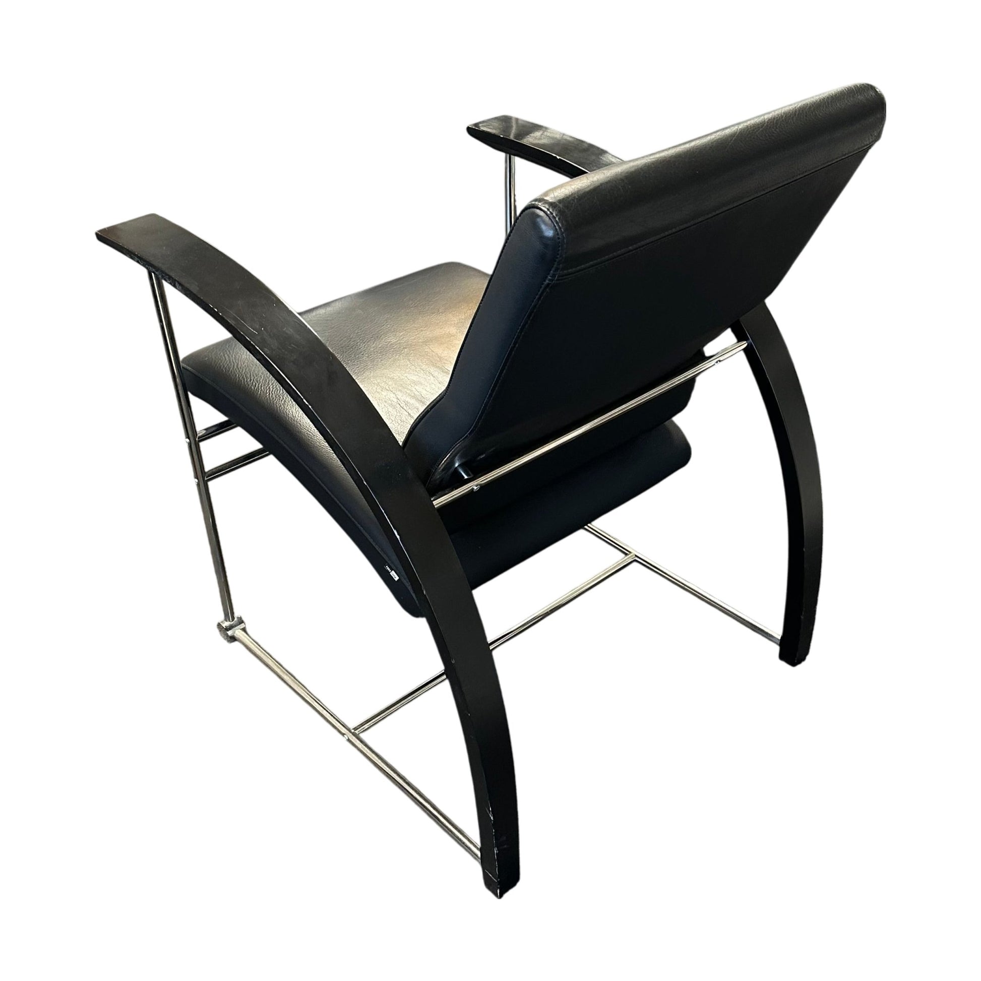Stilren møteromsstol fra Fora Form med armlener, kledd i holdbart svart skinn. Denne stolen er designet for komfort og stil, og passer perfekt til møter eller kontormiljøer hvor både funksjonalitet og estetikk er viktig. De rene linjen og tidløse designet gjør den til et ideelt valg for moderne arbeidsplasser.