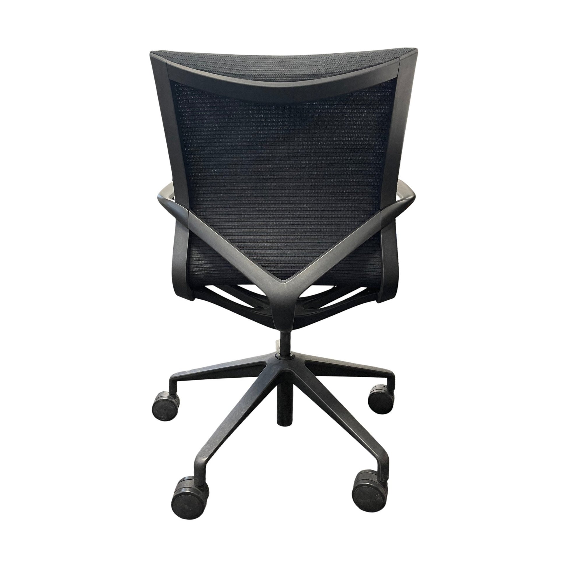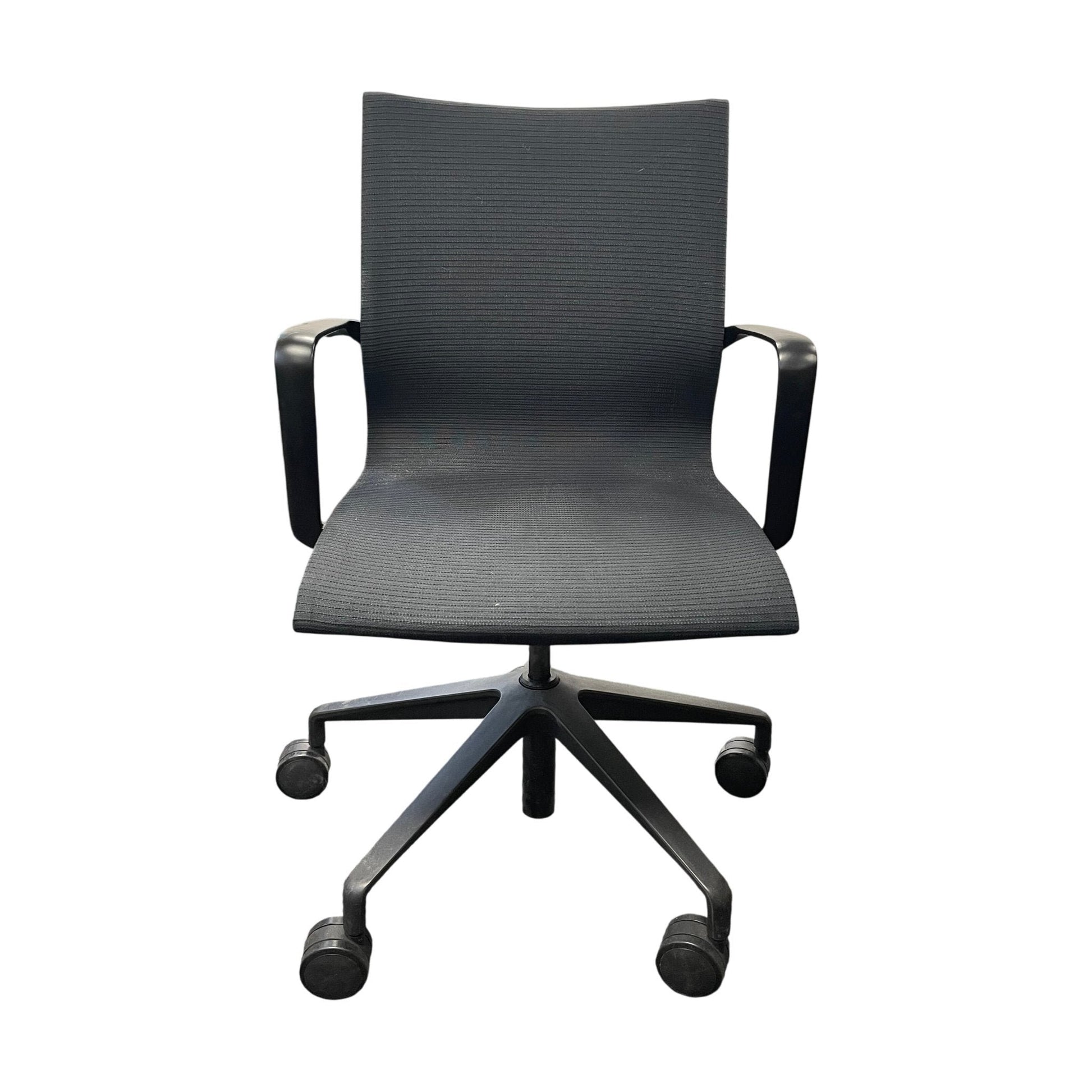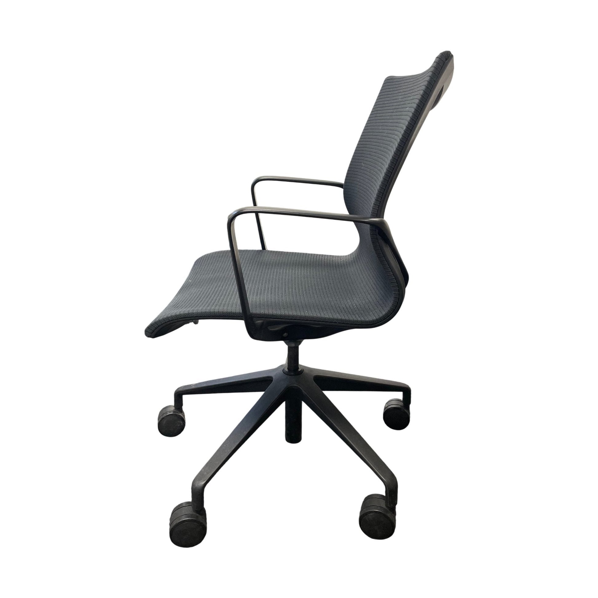 Stolen er i god tilstand med normale bruksmerker, med noen synlige slitasjemerker på armlenet. Sittekomforten er bevart, noe som gjør denne stolen ideell for både møterom og kontorbruk.