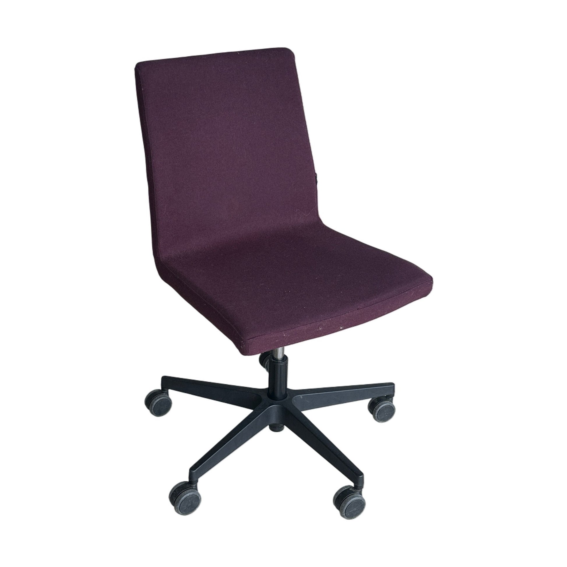 Stolen er pent brukt med noe slitasje og merker i ullstoffet, men helhetsinntrykket er fortsatt svært godt. Bilde 1 viser fargen i et møterom med lite dagslys, bilde 2-4 viser fargen i et åpent kontorlandskap med mye dagslys. Den er klar til bruk og vil være et stilig tillegg til ethvert møterom.