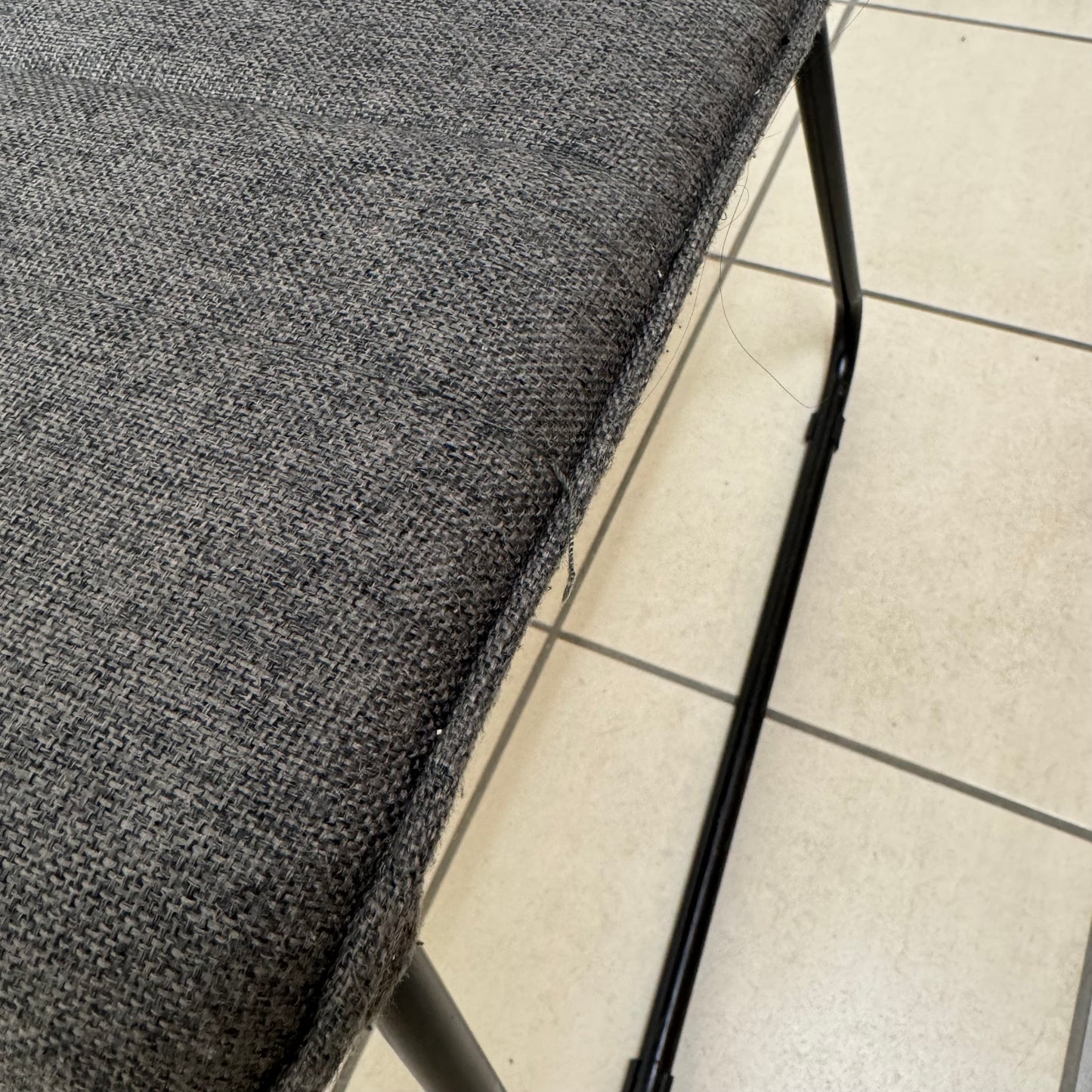 Stolen er synlig brukt med noe slitasje i form av at stoffet er litt "frynsete", men totalinntrykket er for øvrig bra. Sittekomforten er fortsatt god, og stolen er klar til bruk.