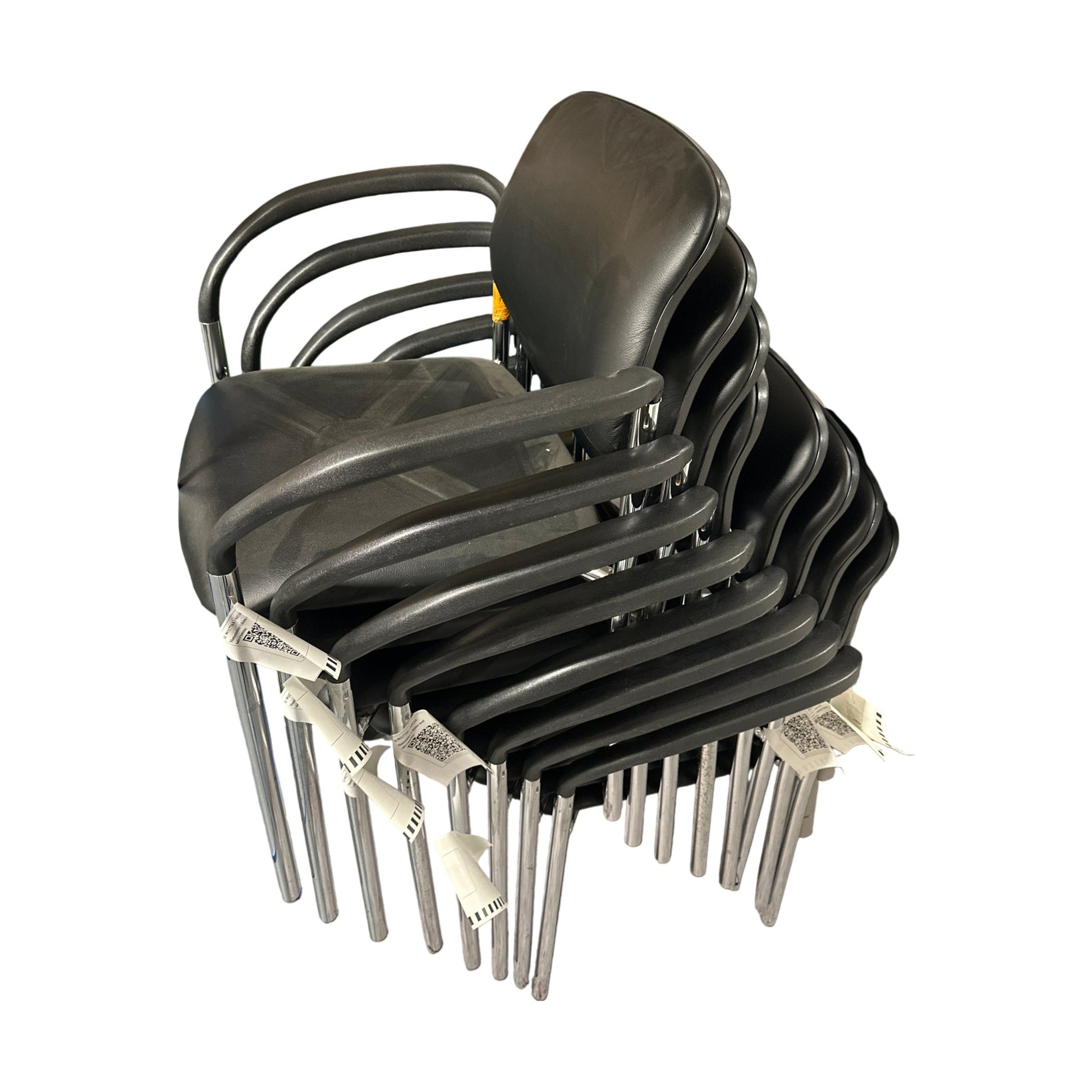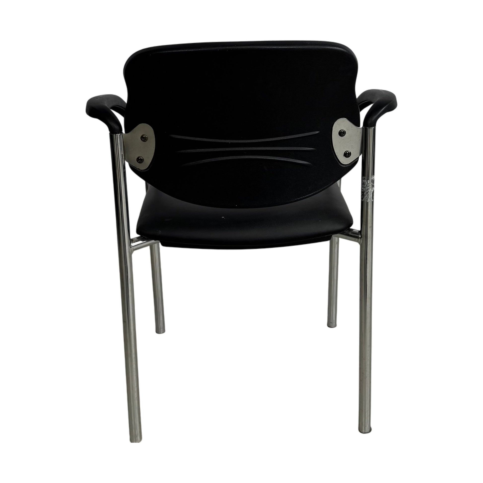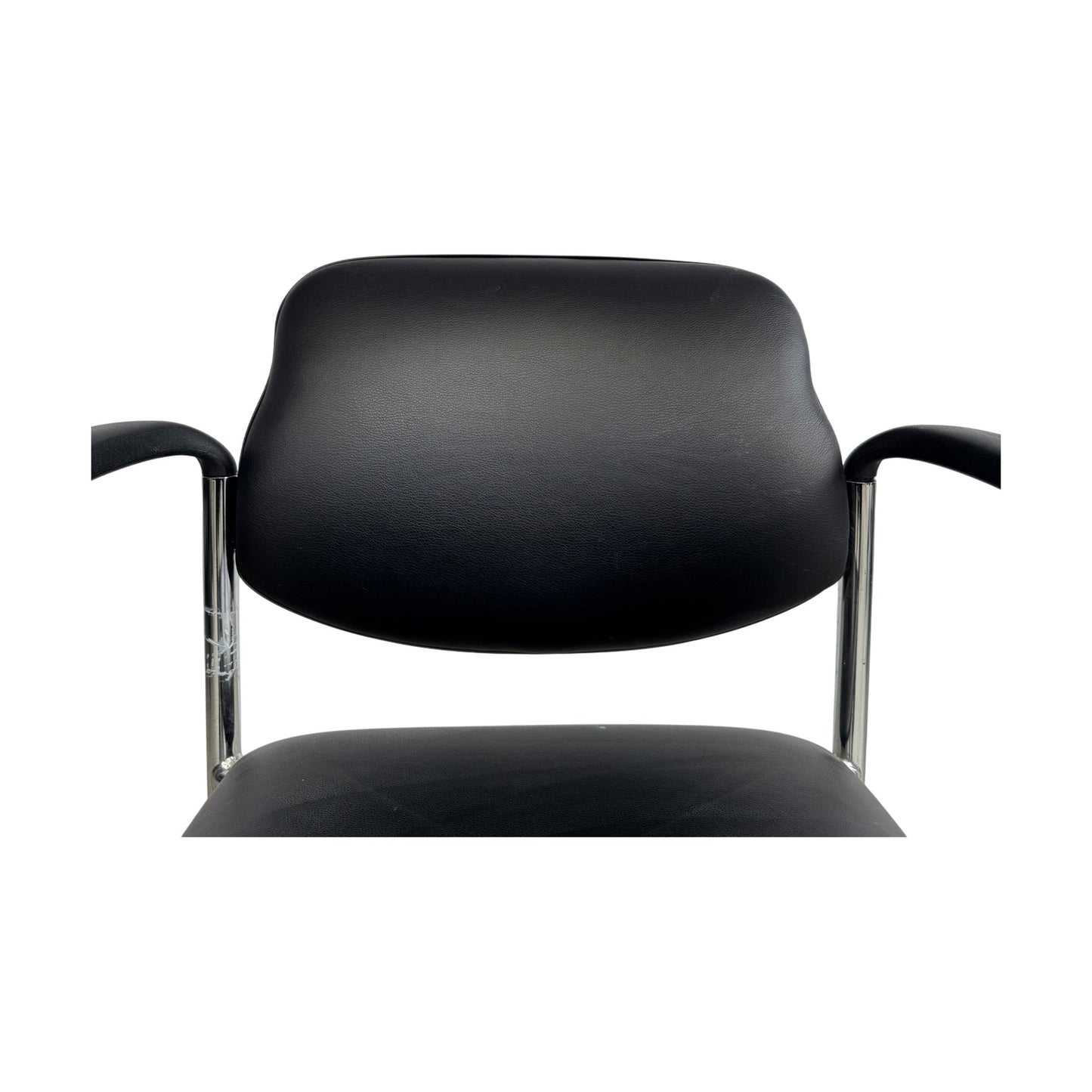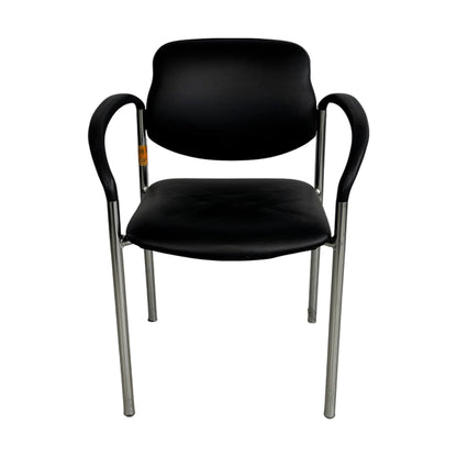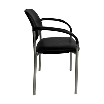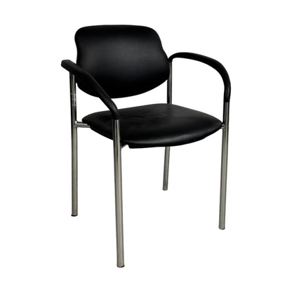 Praktisk møtestol i stilren skinn med sølvramme og armlener. Det stabelbare designet gjør den ideell for møterom og fleksible kontormiljøer, og sikrer enkel oppbevaring når den ikke er i bruk.