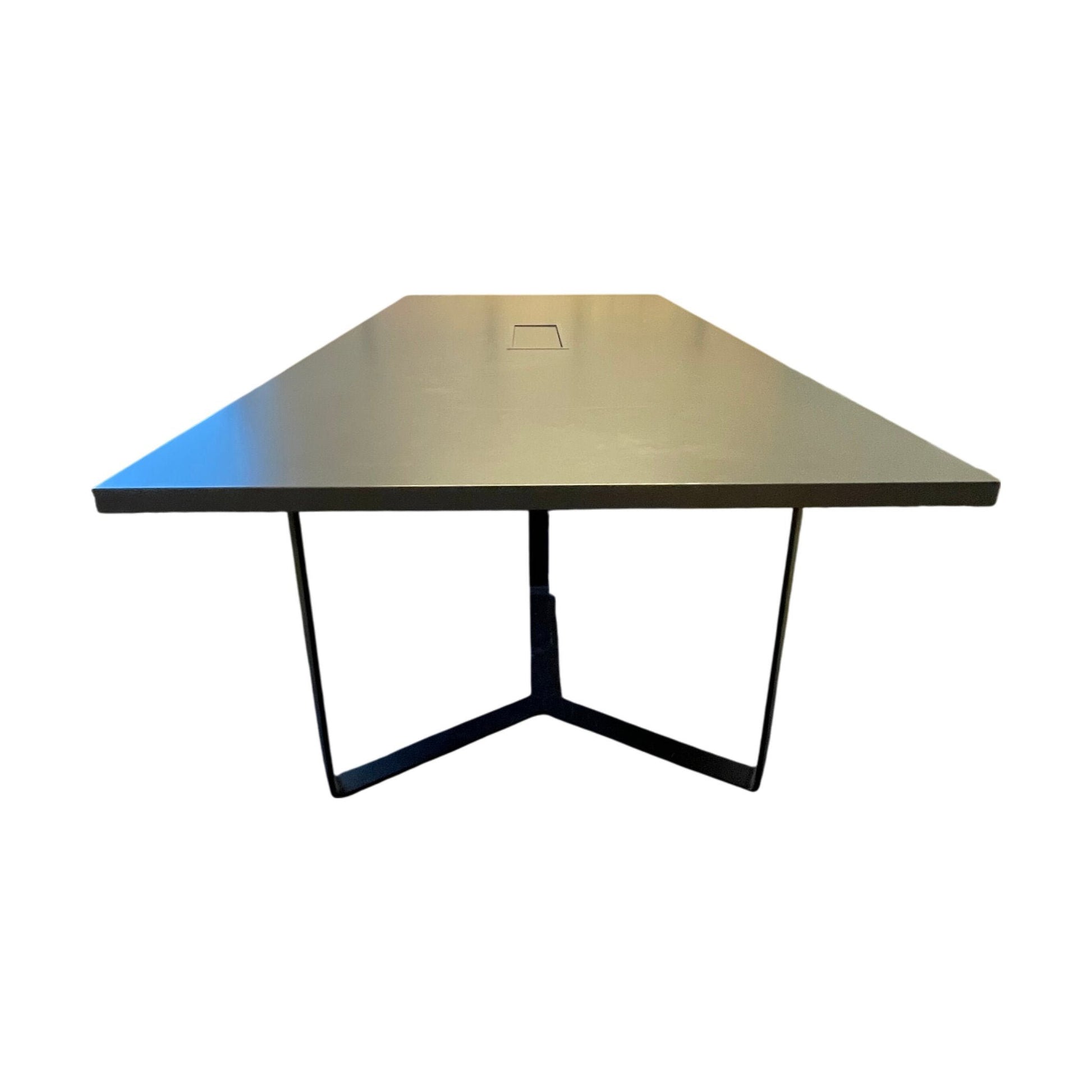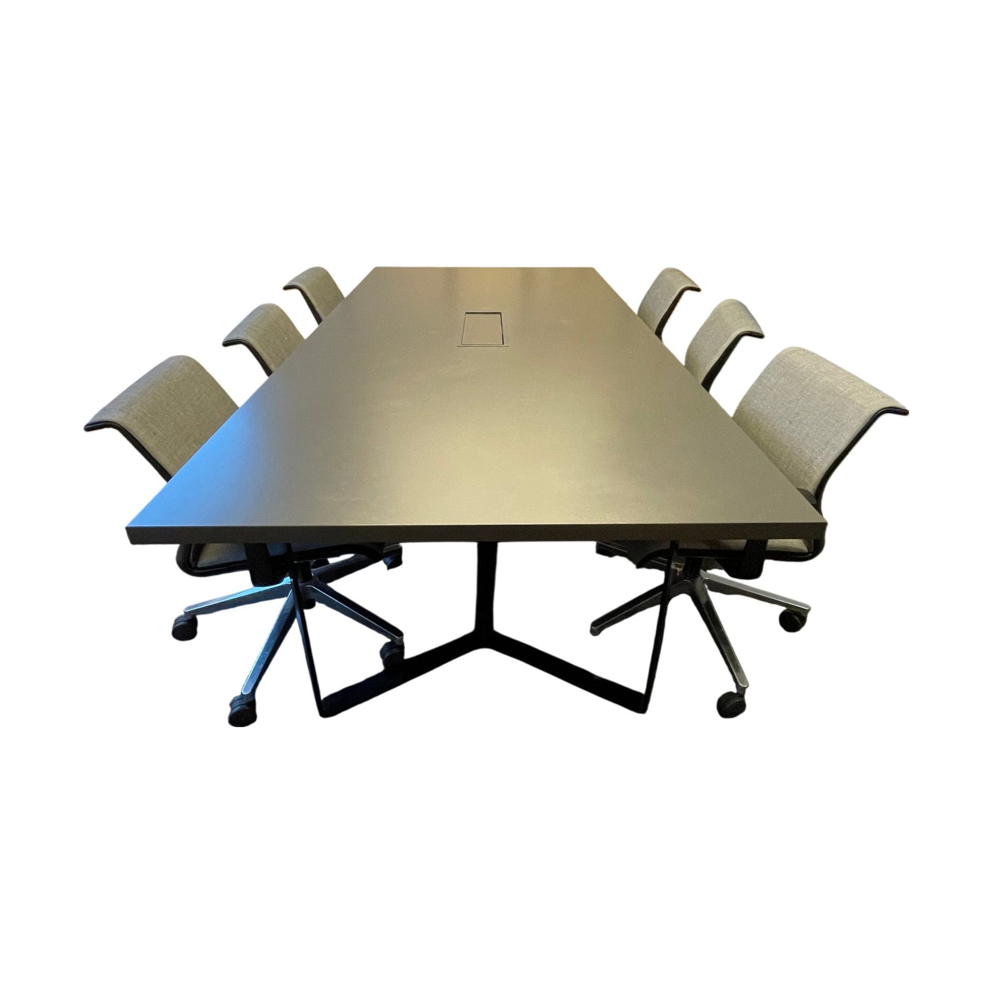 Solid møtebord med en slitesterk mørk grå bordplate og et understell i svart metall. Bordet har en stilren og moderne form, og egner seg godt i møterom, kontorer og andre arbeidsmiljøer.