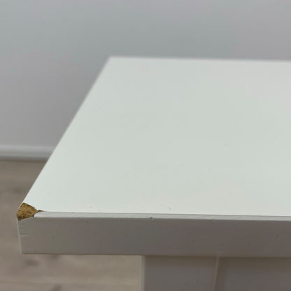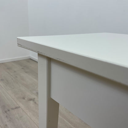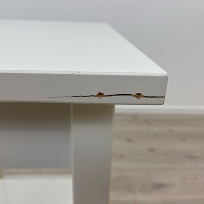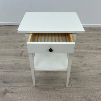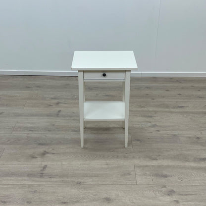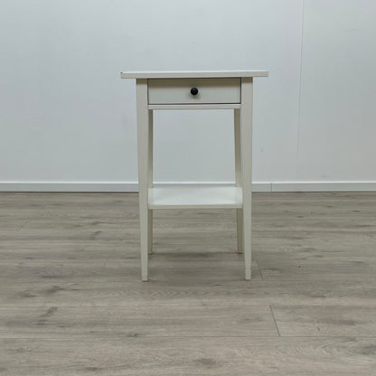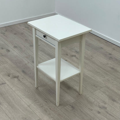 Nattbord i to etasjer med skuff øverst. Nattbordet er godt brukt og har flere bruksmerker, inkludert et hakk foran og sprekk bak.