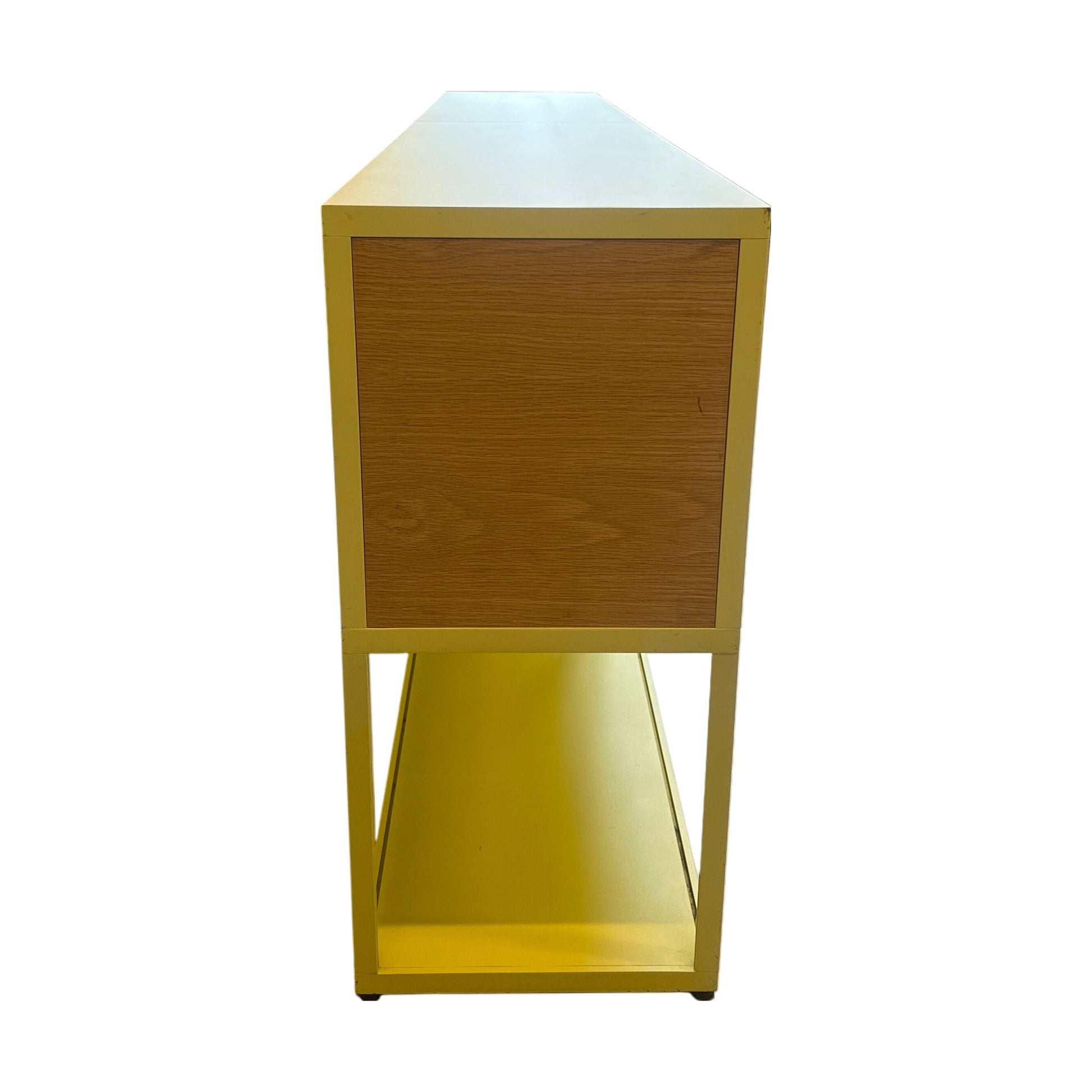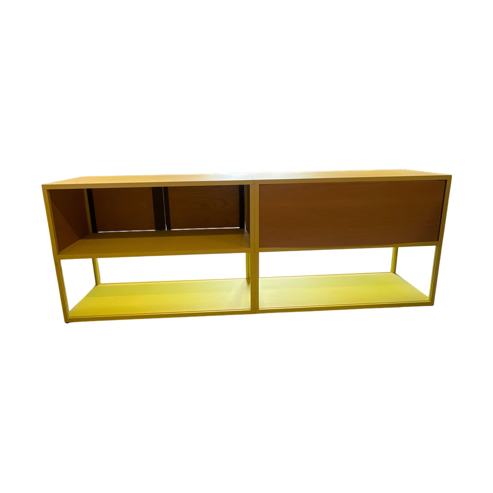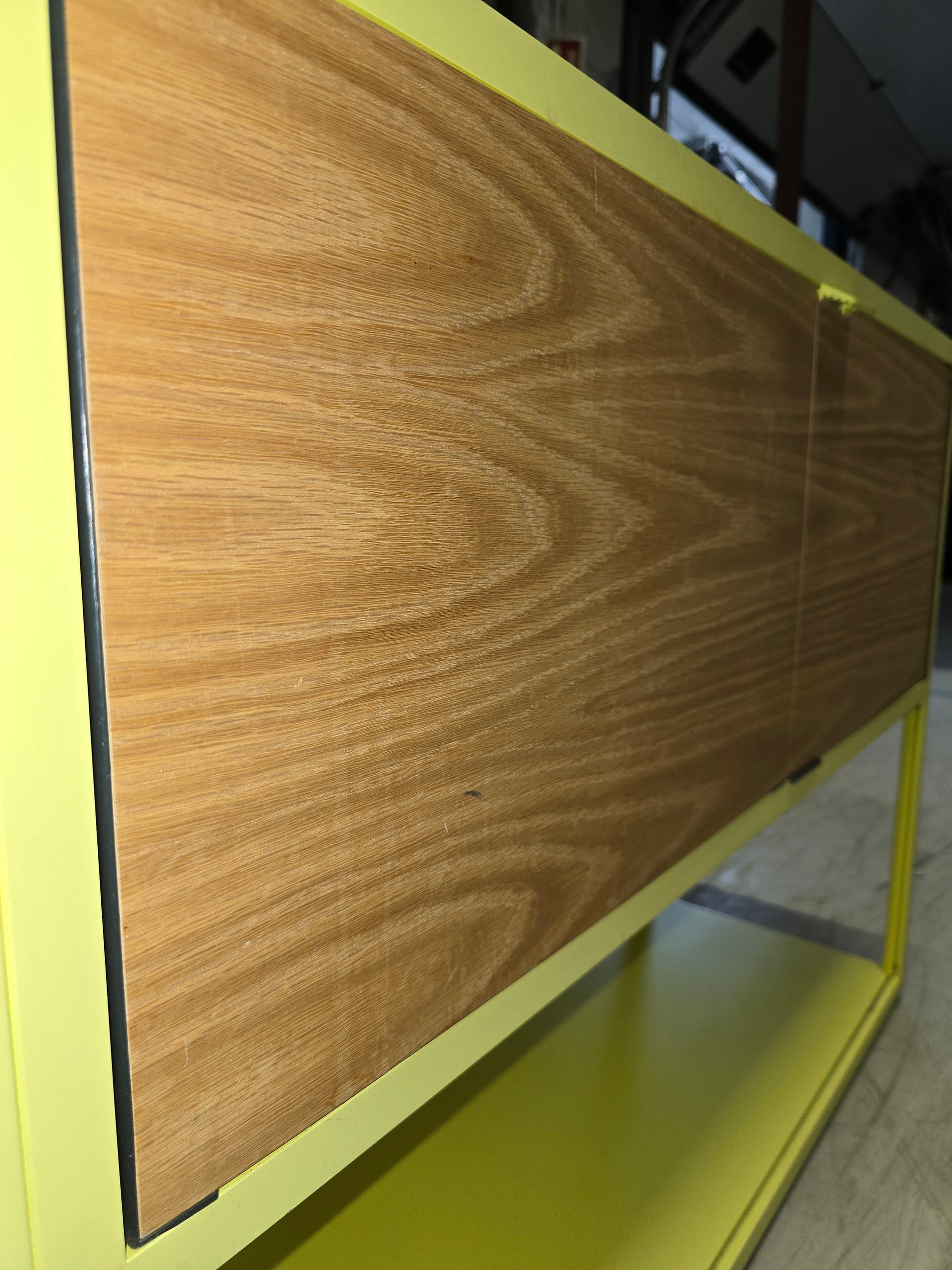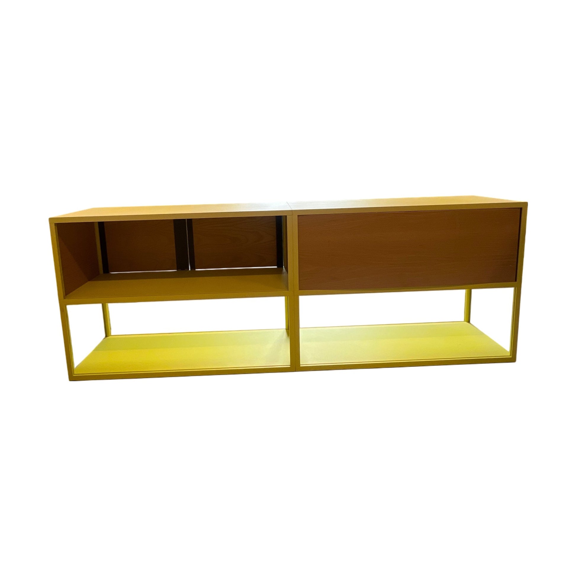 Moderne kommode i en livlig gul farge, designet av HAY i modellen New Order. Denne kommoden en elegant kombinasjon av gule flater og treverk, perfekt for å tilføre et friskt preg til ditt hjem eller kontor. Den åpne hyllen under gir ekstra lagringsmuligheter og skaper en lett og luftig følelse.