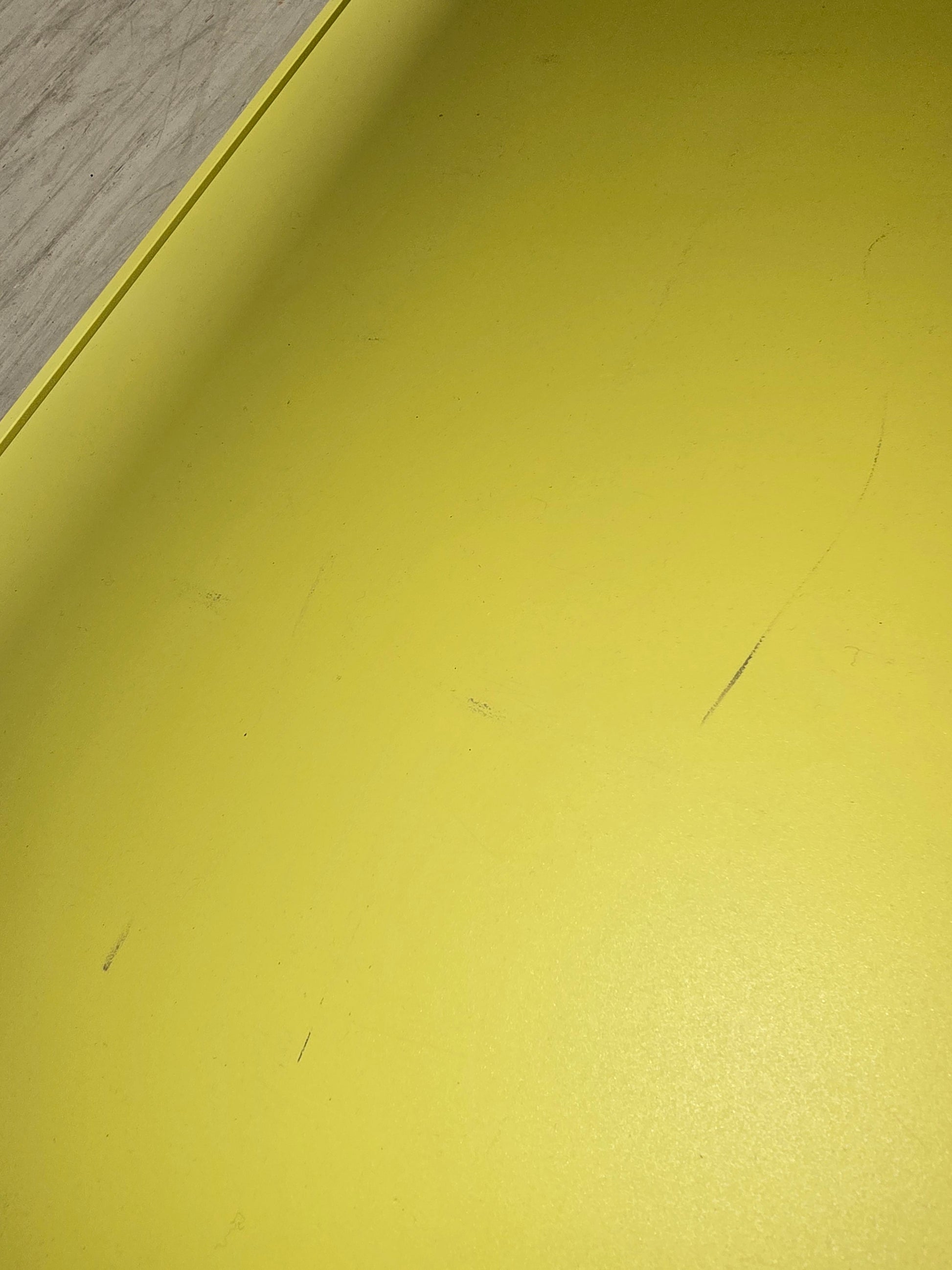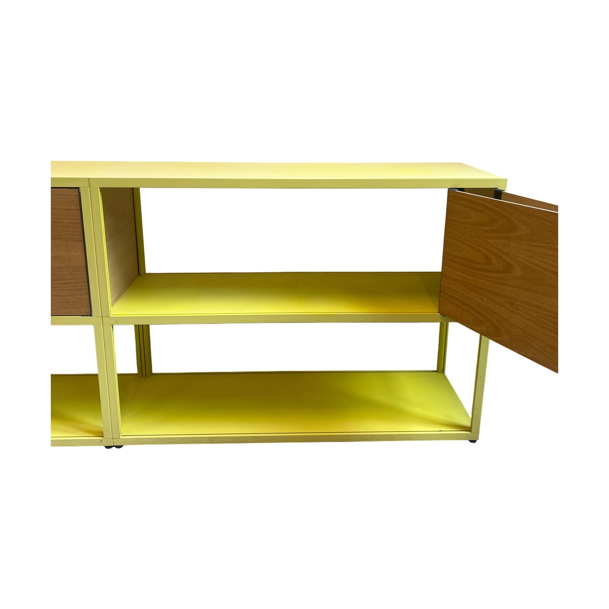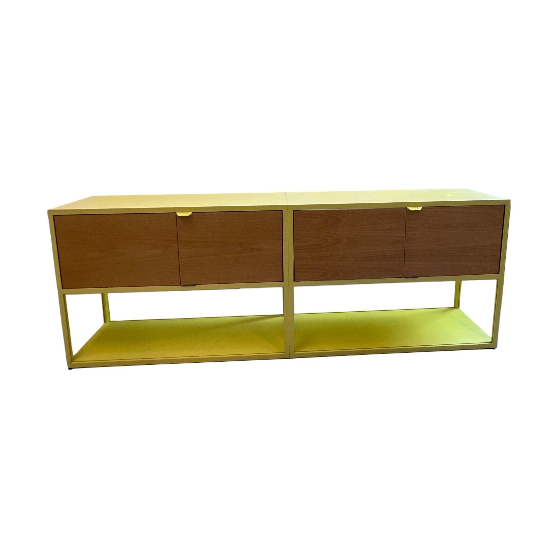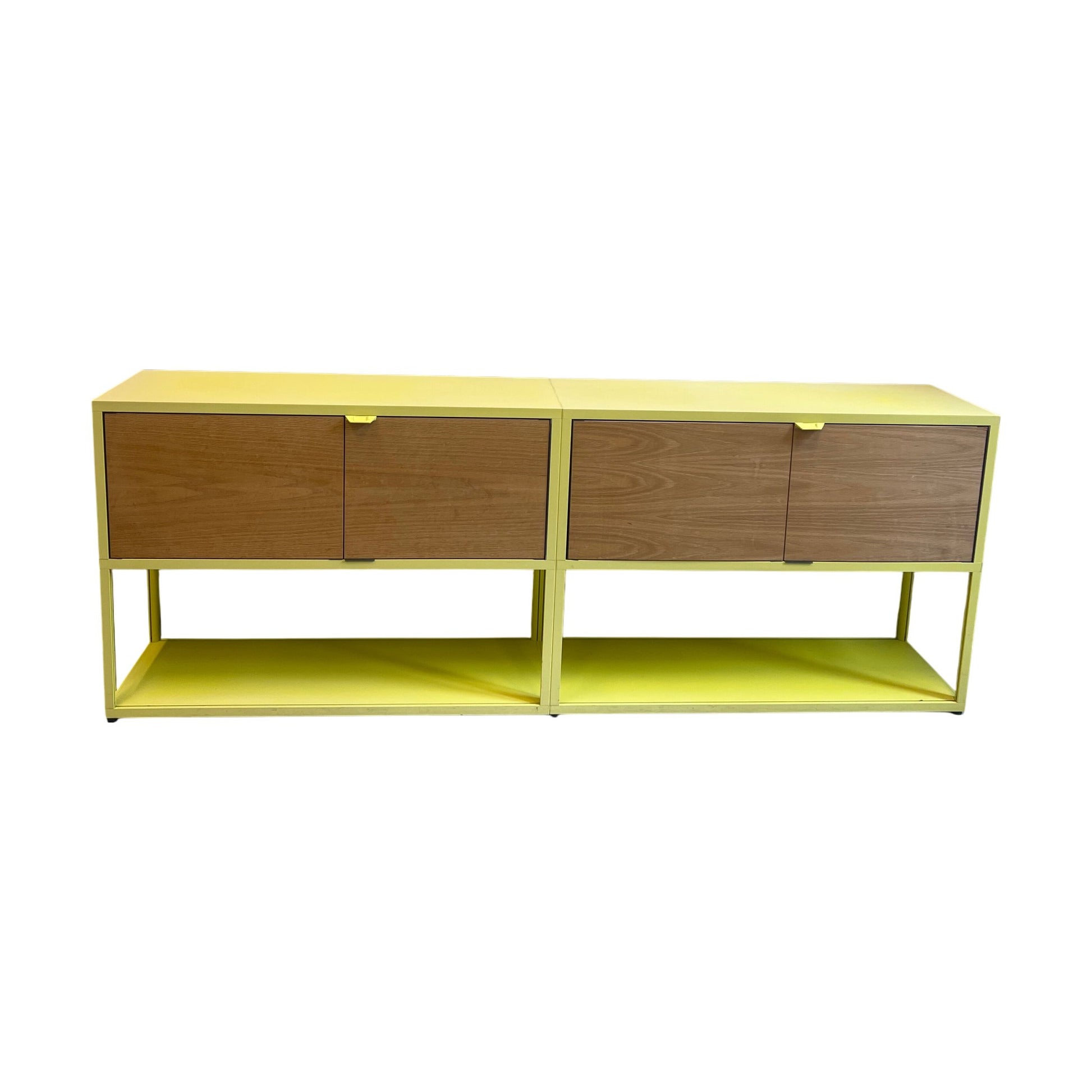 Moderne kommode i en livlig gul farge, designet av HAY i modellen New Order. Denne kommoden en elegant kombinasjon av gule flater og treverk, perfekt for å tilføre et friskt preg til ditt hjem eller kontor. Den åpne hyllen under gir ekstra lagringsmuligheter og skaper en lett og luftig følelse.