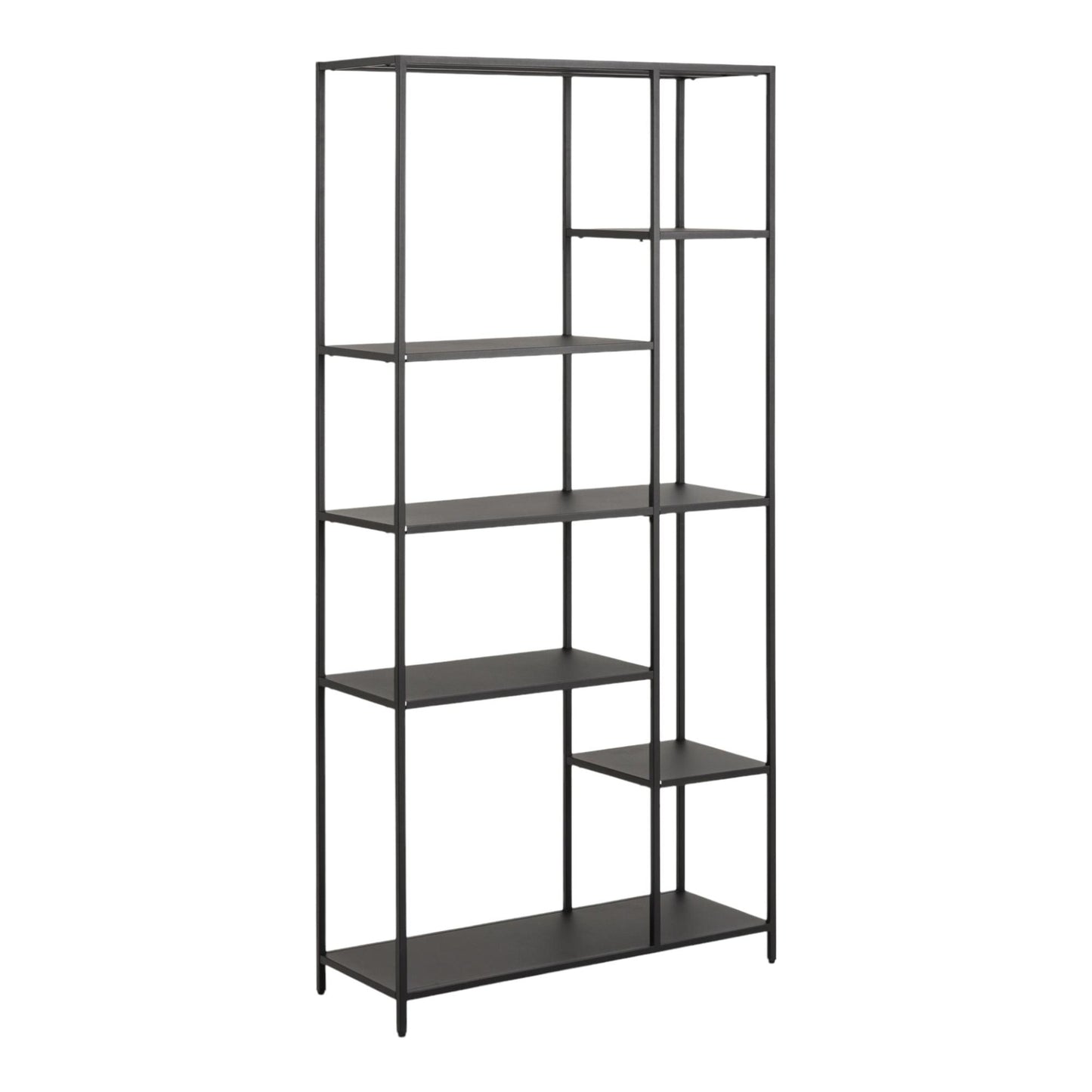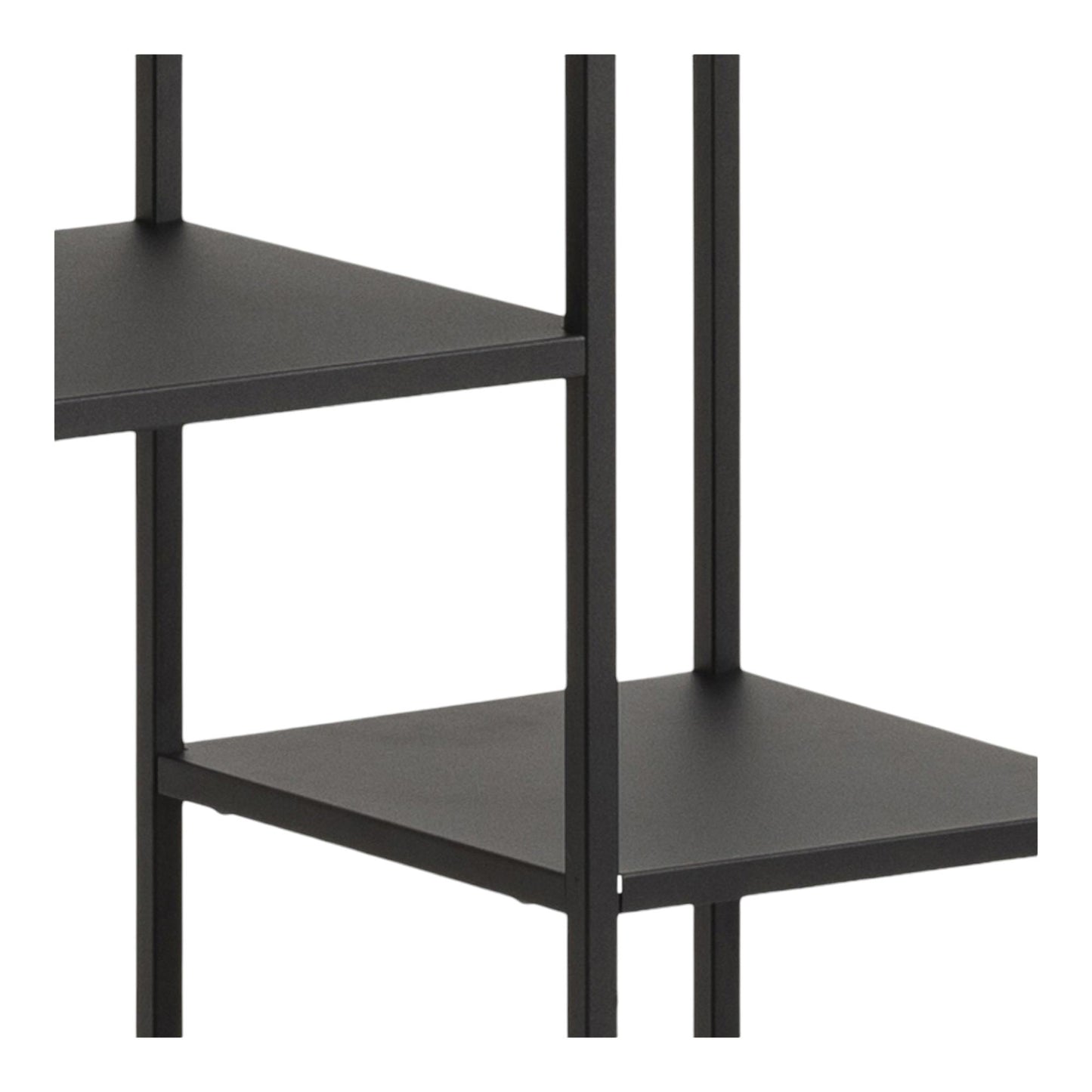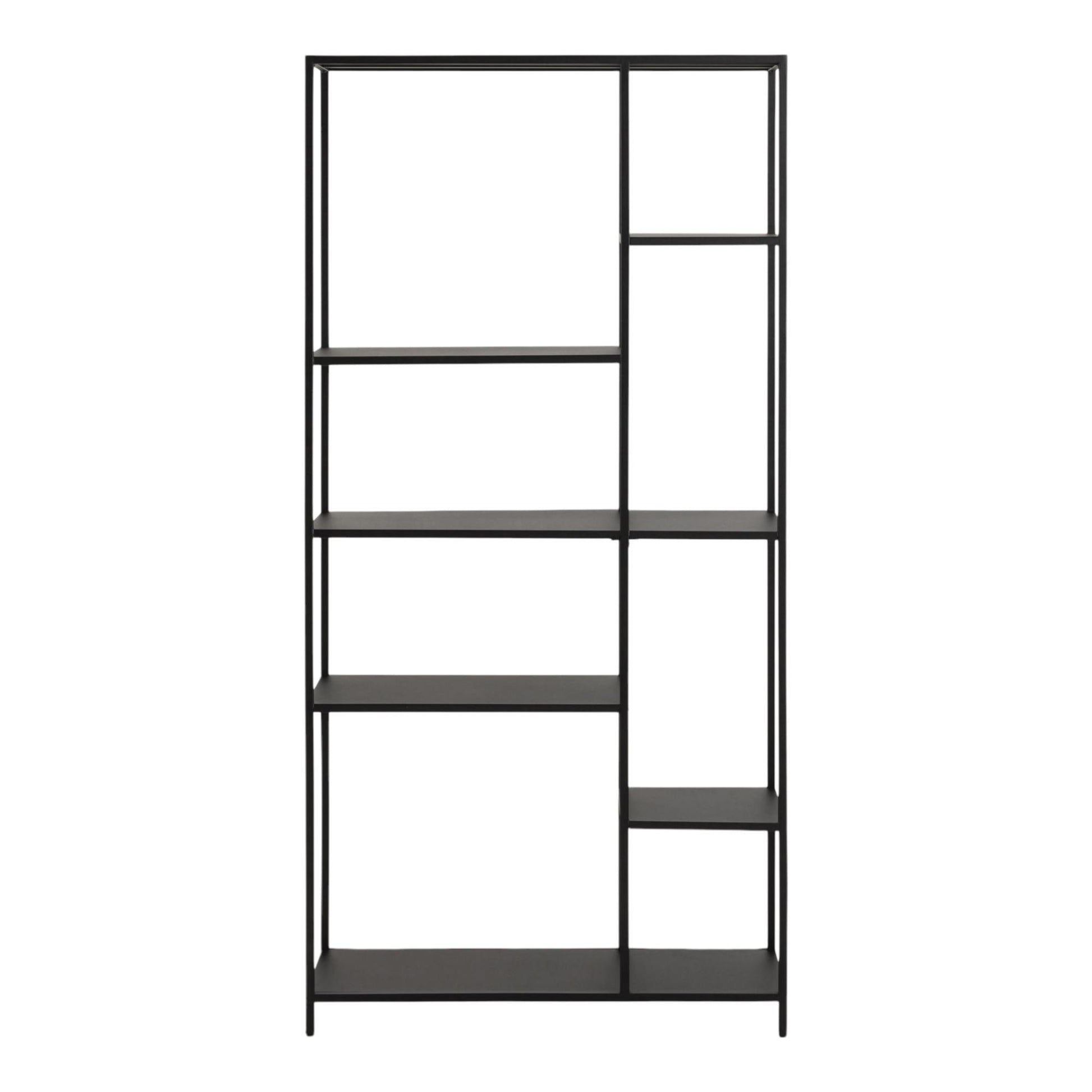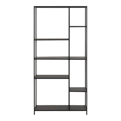 Hyllene er plassert asymmetrisk slik at det skapes forskjellige rom og former.