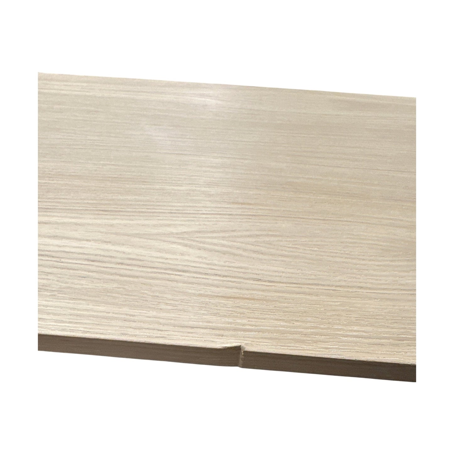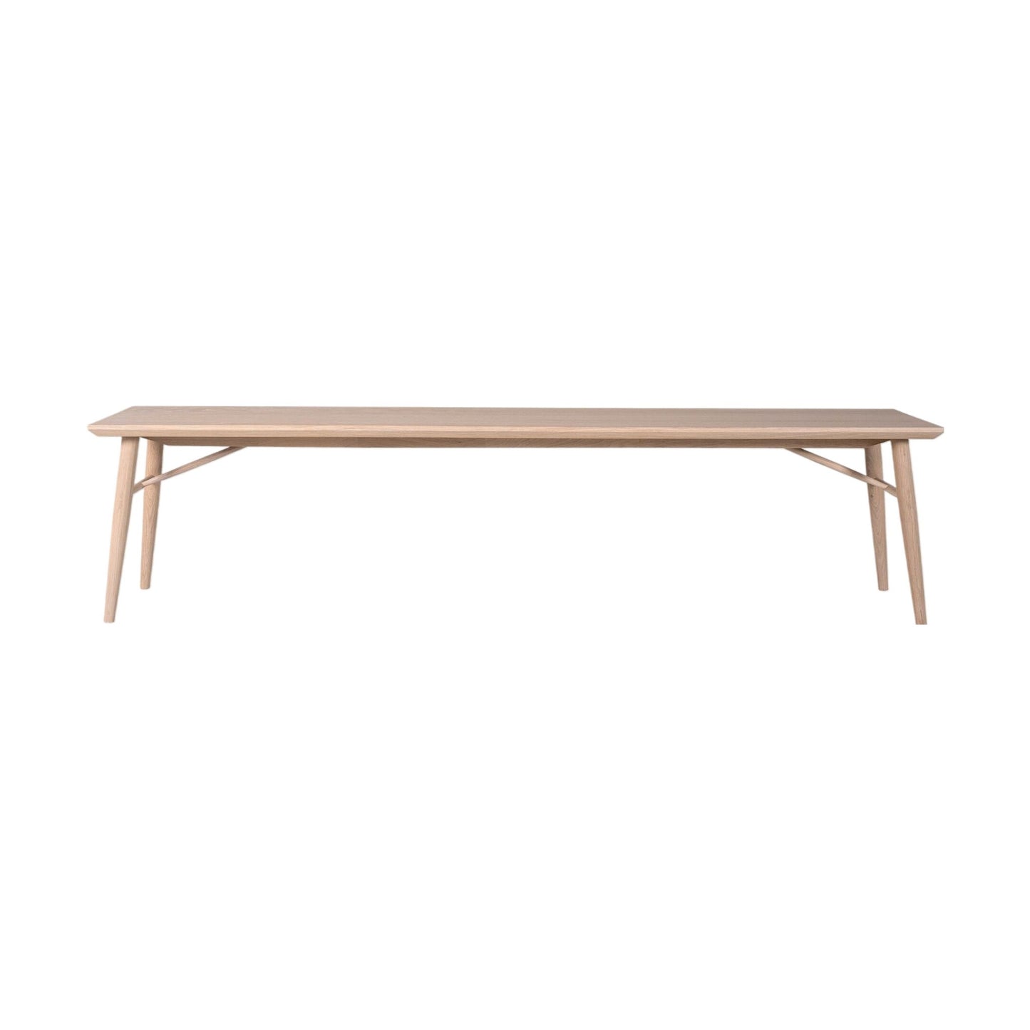 Nora spisebenk fra Kid, med mål 40x190 cm, er et stilrent og praktisk møbel med en naturlig beige farge. Benken har en enkel, moderne design med slanke, avsmalnende ben som gir et lett inntrykk. Selv om benken er godt brukt og står noe ustabilt, fungerer den fortsatt som normalt, og de synlige hakkene langs kanten gir et særpreg som kan passe godt i et uformelt interiør.