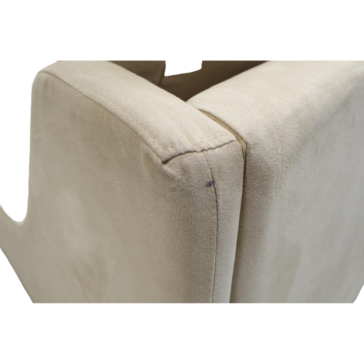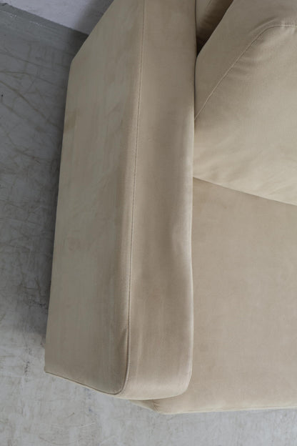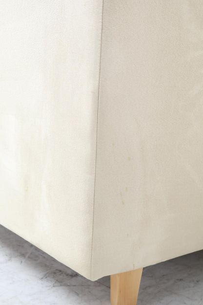 Sofaen viser tegn til bruk med nedsunket armlene, bruksmerker på puter og et usynlig brennmerke på ryggen når putene er på plass. Små hull på en pute er nøye sydd igjen. Renset og klar for rask levering.