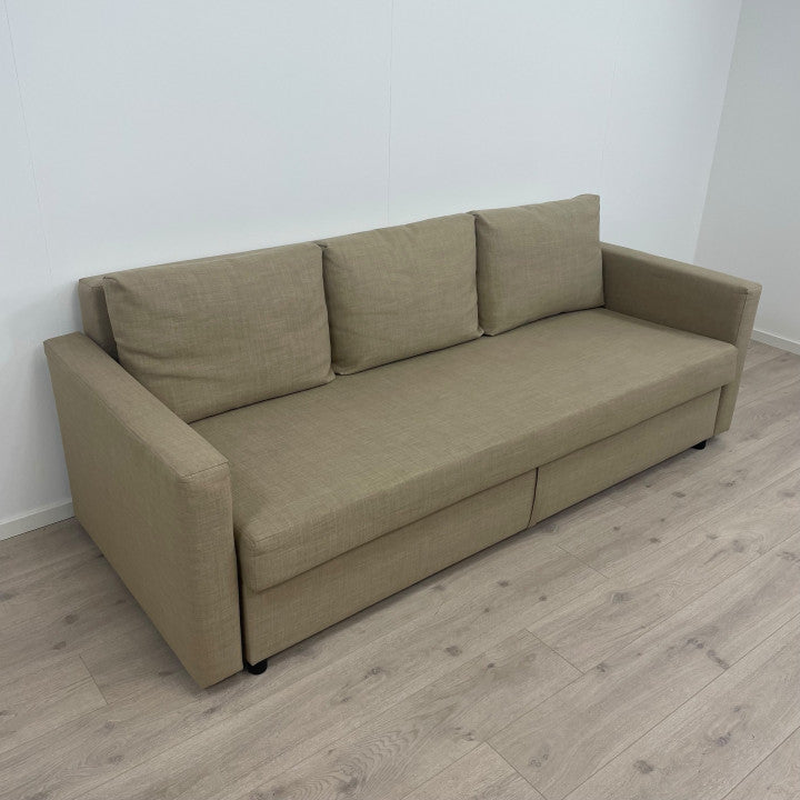 Beige IKEA Friheten 3-seter sovesofa med avtagbare/vaskbare trekk på ryggputer. Uttrekkbar seng med soveplass til to personer. Sofaen fremstår som pen med få bruksmerker. Sofaen knirker litt når man setter seg ned. Renset og Leveringsklar.