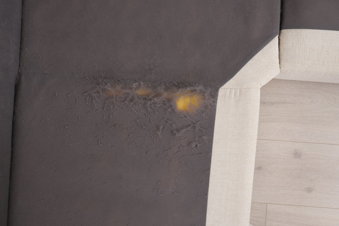 Deretter ser vi etter skader både i konstruksjonen og i stoffet, for så å utbedre disse. Videre blir sofaen grundig støvsuget med industristøvsuger før renseprosessen starter.