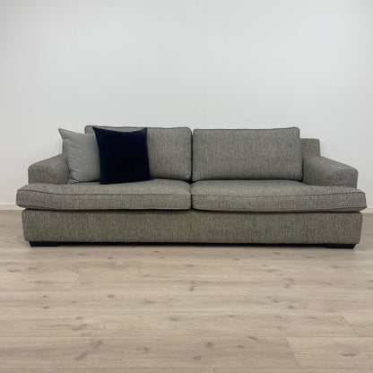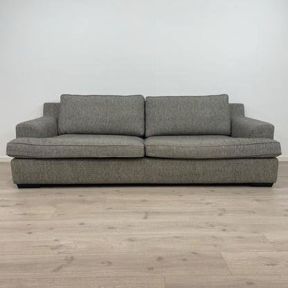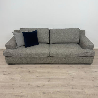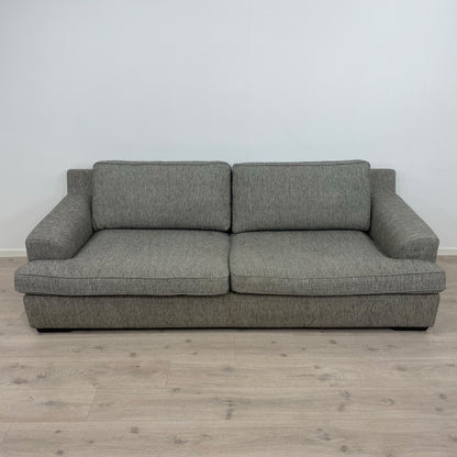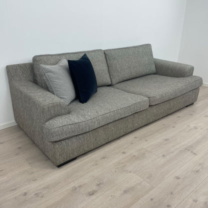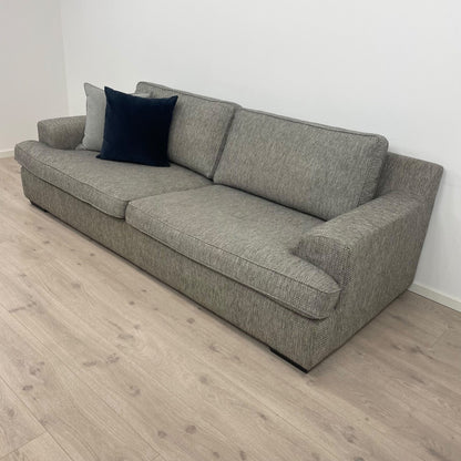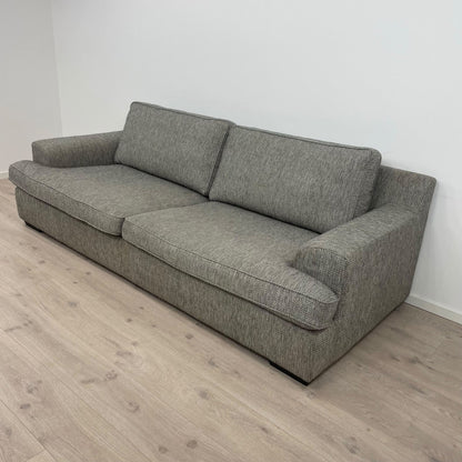 Bred og dyp 3-seter sofa med avtagbare/vaskbare trekk på samtlige puter. Sofaen fremstår som godt brukt. Noen flekker på sitteputer som ikke går bort i rens - se siste produktbilde. Ganske nedsittet. Tidligere eier hadde hund og det finnes derfor noe hår under putene. Renset og Leveringsklar.
