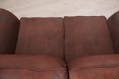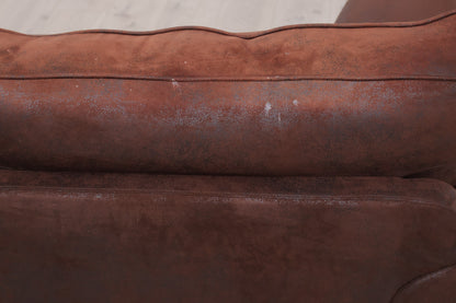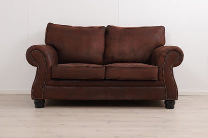 Brun 2-seter sofa i fløyelsaktig stoff. Sofaen fremstår som helhetlig pen og har god og myk sittekomfort. Normal bruksslitasje. Et par hull i filten på sofaen under sitteputene men dette er ikke synlig når putene ligger på plass. Noen mindre stearinflekker på toppen/baksiden av den ene ryggputer - se det siste produktbildet. Noen rynker i stoffet på sitteputene - se det nest siste produktbildet. Tidligere eier hadde hund og selv om sofaen er både renset og støvsuget kan det fortsatt finnes spor av hår under putene men dette er ikke sjenerende. Renset og Leveringsklar.