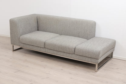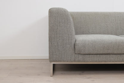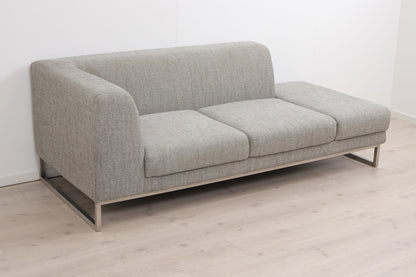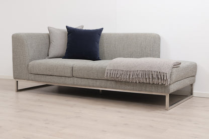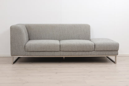 Grå/beige 2,5-seter sofa med åpen ende i et stilrent og moderne design. Sofaen fremstår som helhetlig pen med god sittekomfort og normal bruksslitasje. Noe slitasje/nupper i stoffet mellom sitteputene som vises på produktbildene. Noe mørkere nyanser i stoffet i hjørnet som vises på det siste produktbildet. to-tre hull i filten under sofaen men dette er ikke synlig når sofaen står på plass - se produktbilder. Renset og Leveringsklar.
