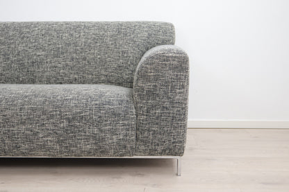 Nyrenset grå/beige hjørnesofa med åpen ende. Sofaen fremstår som helhetlig pen med god sittekomfort og normal bruksslitasje. Noen nupper på putene, i tillegg til å være litt ujevn i fargen på stoffet, men dette er ikke sjenerende. Ellers i fin stand. Renset og leveringsklar.