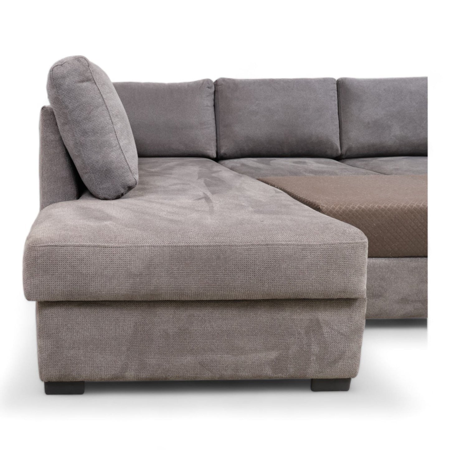 Sofaen har normal bruksslitasje i stoffet og et revnet hjørne. En solid sovesofa som gir god komfort og praktisk bruk.