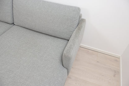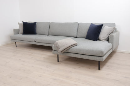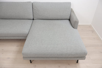 Grå IKEA Klintorp sjeselongsofa med avtagbare/vaskbare trekk på samtlige puter. Sofaen fremstår som helhetlig pen og har god og myk sittekomfort med normal bruksslitasje. Har slitasje/misfarging på toppen av det høyre armlenet som vises på det siste produktbildet - dette kan dekkes til med et pledd. Tidligere eier hadde katt og selv om sofaen både er renset og støvsuget kan det fortsatt finnes spor av hår i sofaen under putene men dette er ikke sjenerende. Et par skjolder på filten på sofaen under sitteputene men dette er ikke synlig når putene ligger på plass. En glippe mellom stiftene på to områder under den ene sofadelen men dette påvirker ikke bruken av sofaen - se det nest siste produktbildet. Ellers fin i formen. Renset og Leveringsklar.