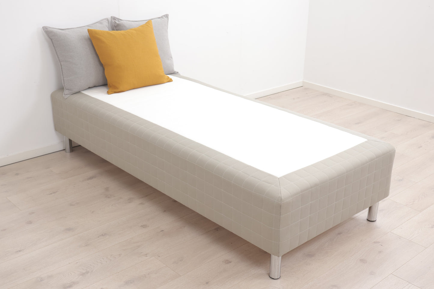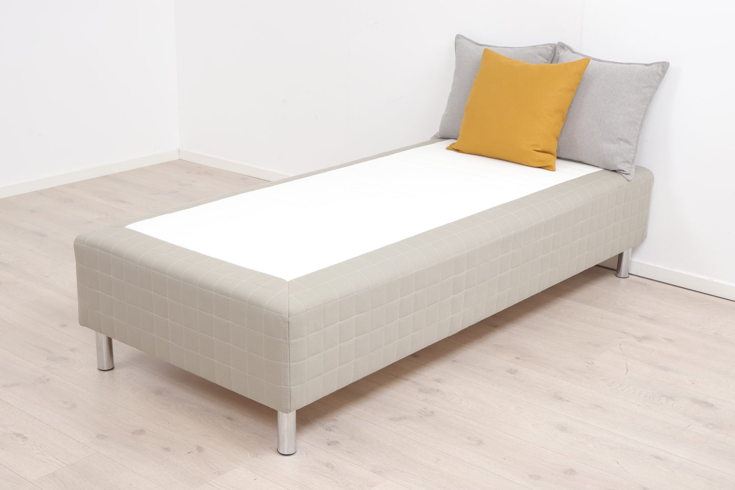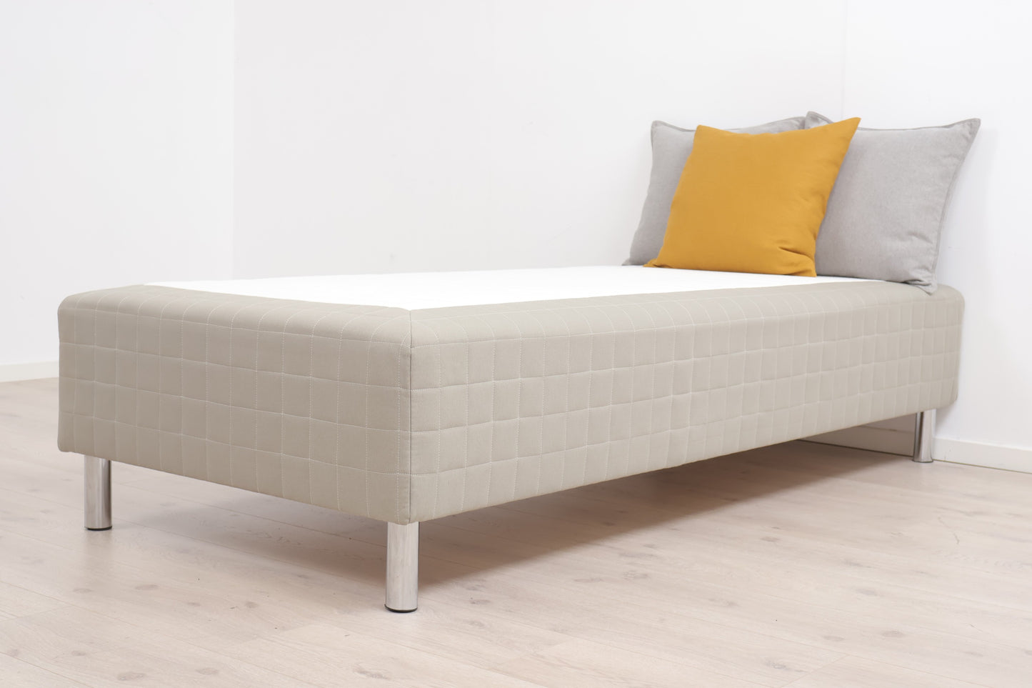 Nyrenset grå IKEA Skårer seng 90cm x 200cm. Sengen fremstår som helhetlig pen med god komfort og normal bruksslitasje. Sengen mangler de originale beina, men vi har montert nye metallbein som fungerer fint. Renset og leveringsklar.