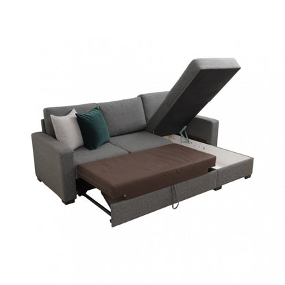 Grå sovesofa med sjeselong med praktisk oppbevaringsrom under sjeselongen. Avtagbare/vaskbare trekk på ryggputer samt uttrekkbar seng med soveplass til to personer. Sofaen fremstår som helhetlig pen med normal bruksslitasje. Solfalmet på sjeselongen som vises på det siste produktbildet samt noen merker bakerst i oppbevaringsrommet. Noe myk sittekomfort. Renset og Leveringsklar.