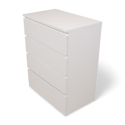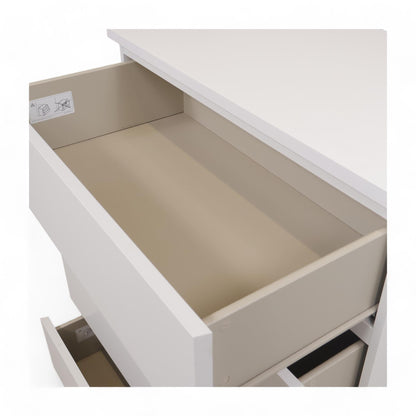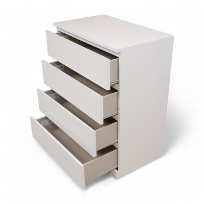 Denne praktiske kommoden fra IKEA, modell Malm, har fire romslige skuffer for effektiv oppbevaring. Med en bredde på 80 cm, dybde på 48 cm og høyde på 100 cm, passer den perfekt til soverommet eller stuen.
