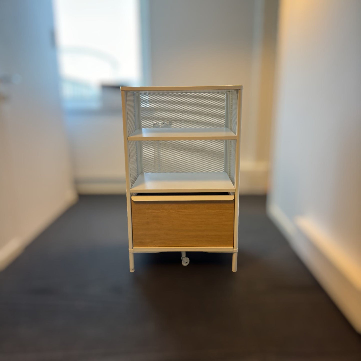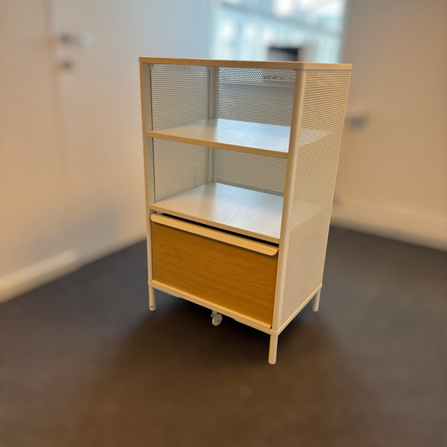 Hyllen har to åpne hyller og en skuff nederst, ideell for både hjem og kontor. Rask levering tilgjengelig.
